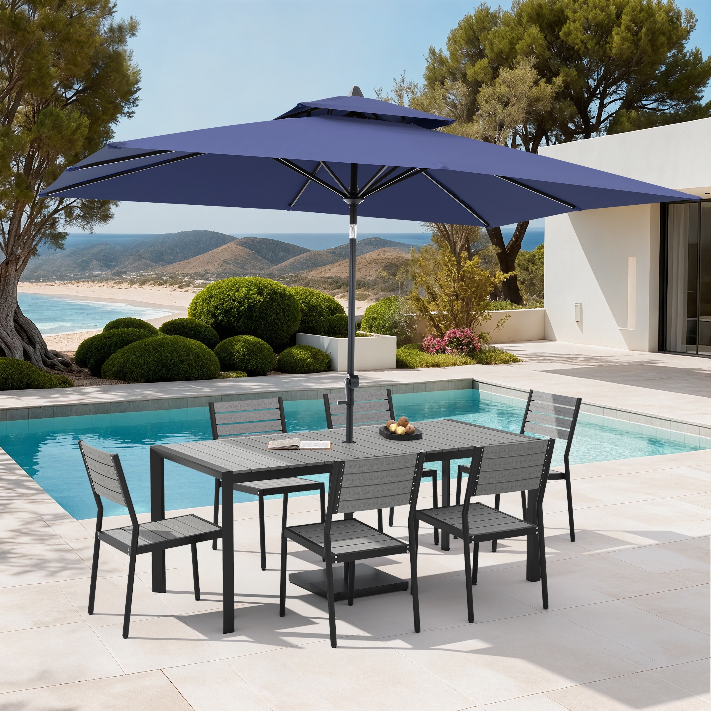 11PC Outdoor Patio Dining Set WoodLike Aluminum Umbrella Hole Table with Folding Chair,Double Top Market Umbrella and Wheel Base