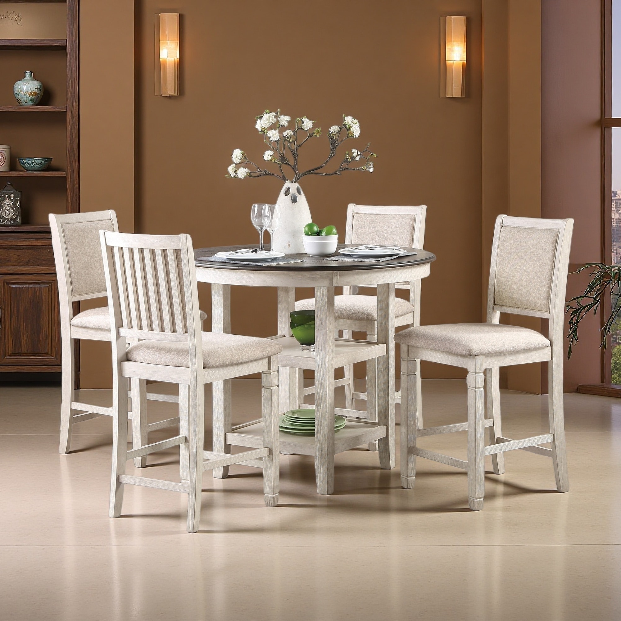 Set of 5 Counter Height 42" Round Table with Built-in Shelves, 4x Counter Height Chairs, 5-Piece Dining Set