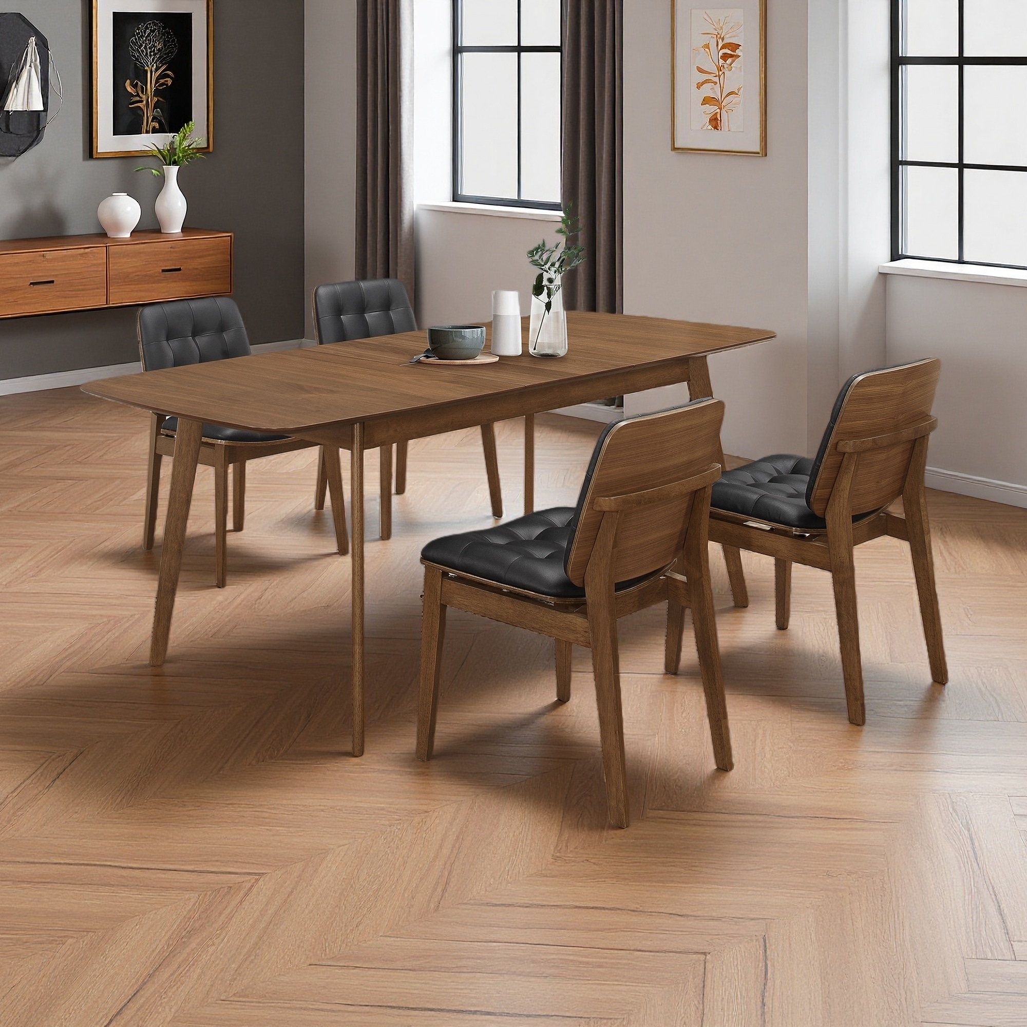 Set of 5 Rectangular 59"L Dining Set - Natural Walnut, Butterfly Extension Leaf, Mid-Century with Leatherette Cushioned Chairs