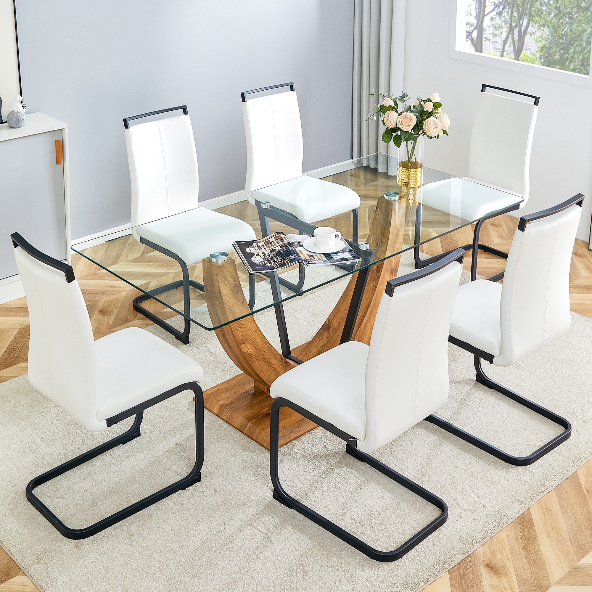 Elegant 71" Tempered Glass Dining Set with 6 White PU Cushioned Chairs & Black Metal C-Tube Legs, Natural Style for Home