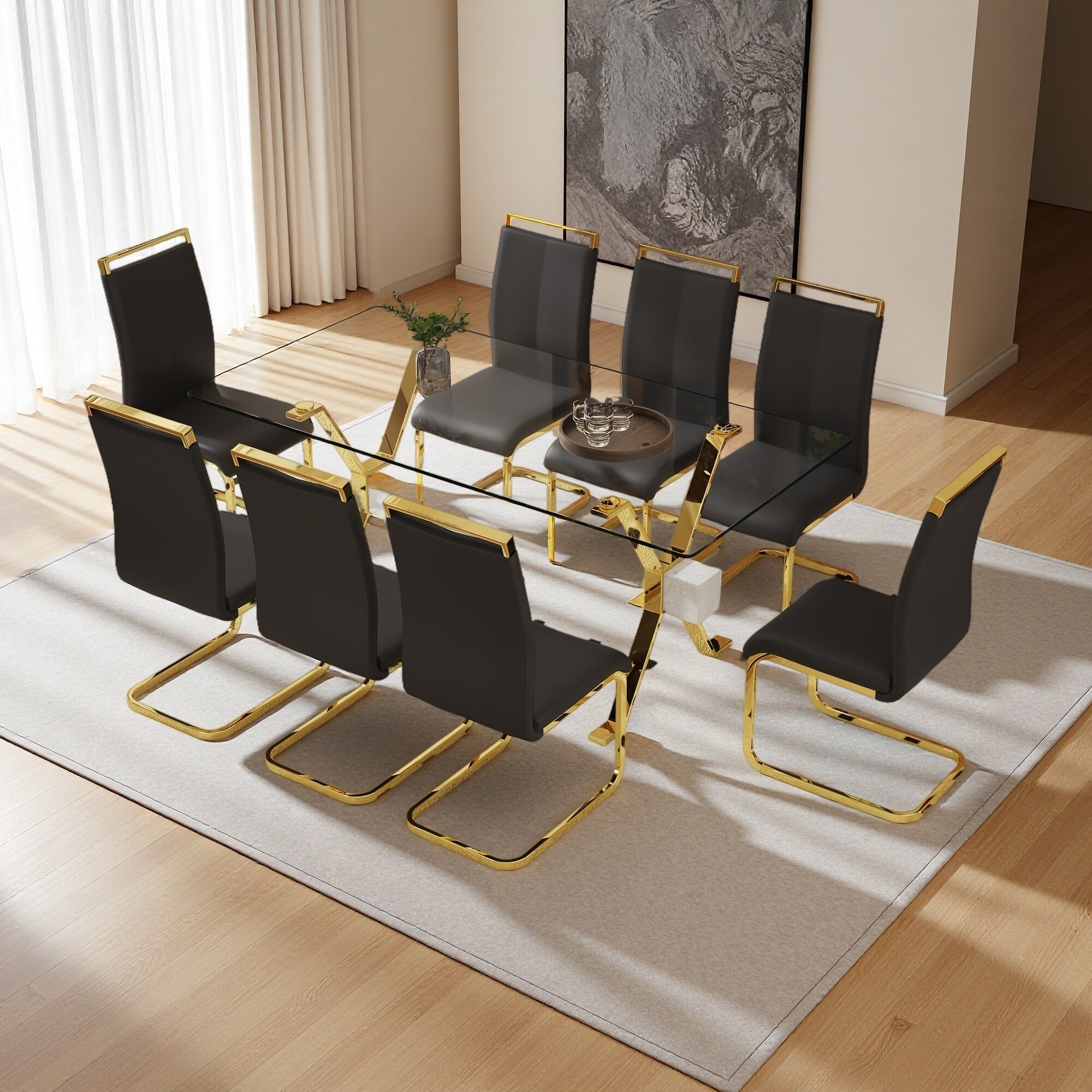 71"x35.4" Elegant Transparent Tempered Glass Dining Table Set with 8 PU Chairs and C-Tube Metal Legs