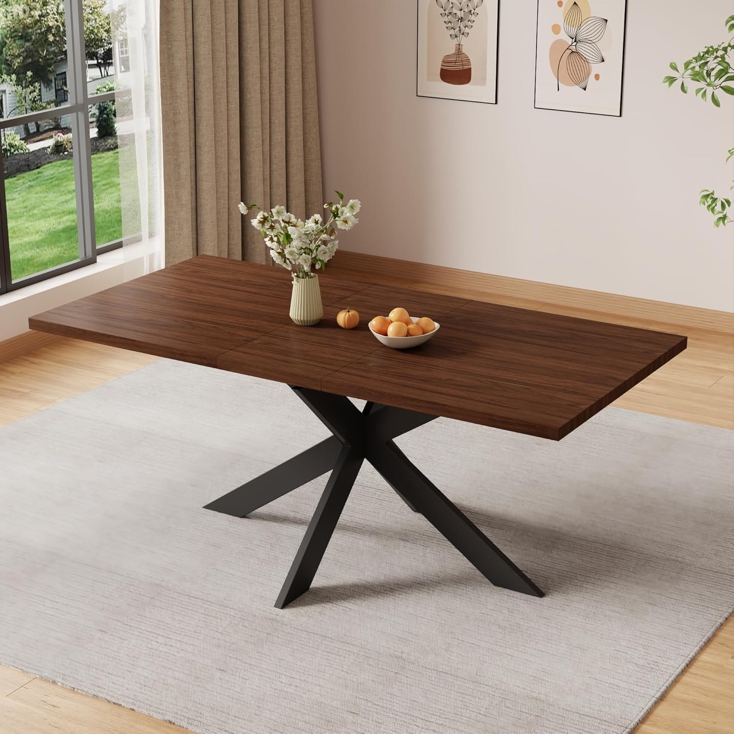 Extendable Walnut Finish Dining Table with Sturdy Metal Frame, Fits 6-8 People, Easy Assembly