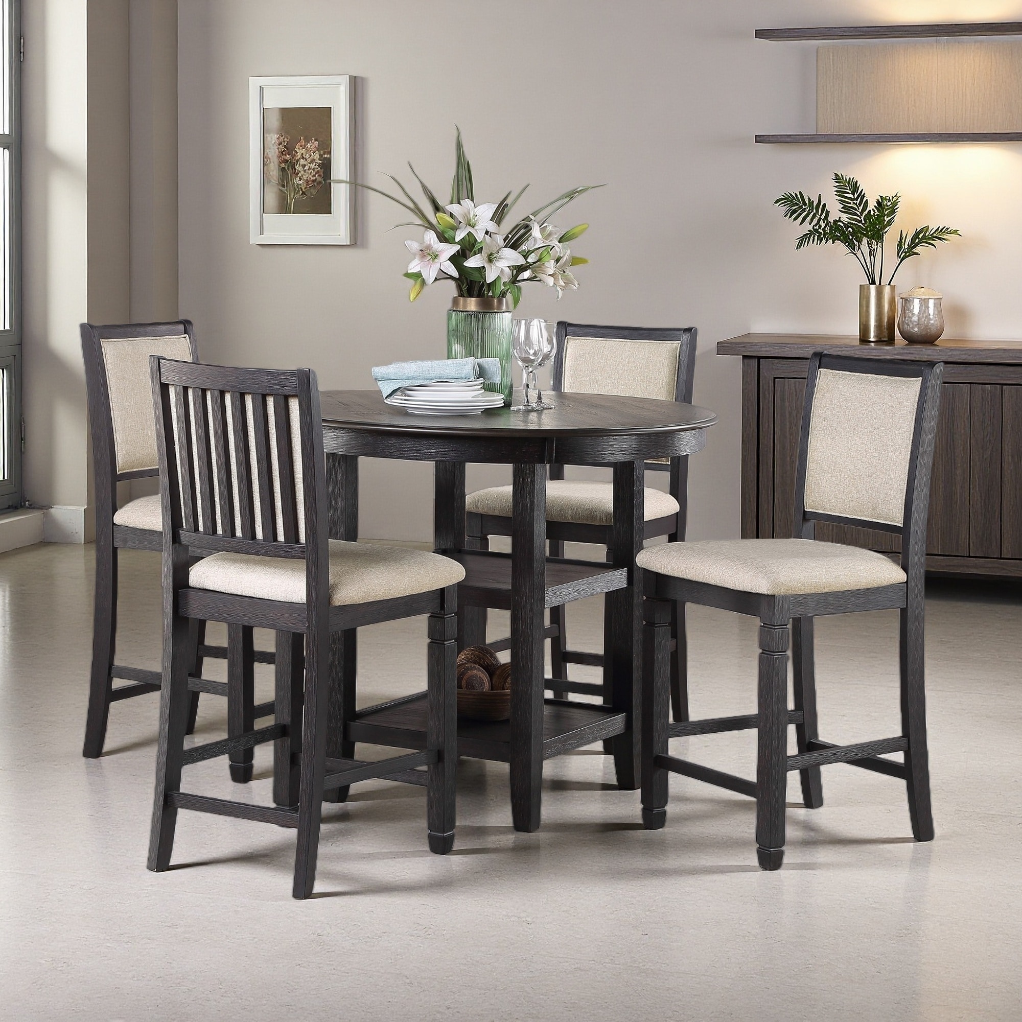 Set of 5 Counter Height 42" Round Table with Built-in Shelves, 4x Counter Height Chairs, 5-Piece Dining Set