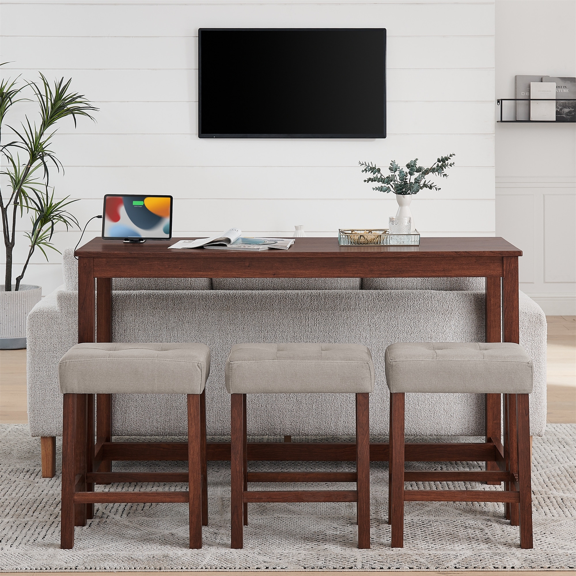59" Counter Height Bar Table Set with Power Outlet, Industrial Breakfast Table with 3 Stools, 4 Piece Bar Table and Chairs Set
