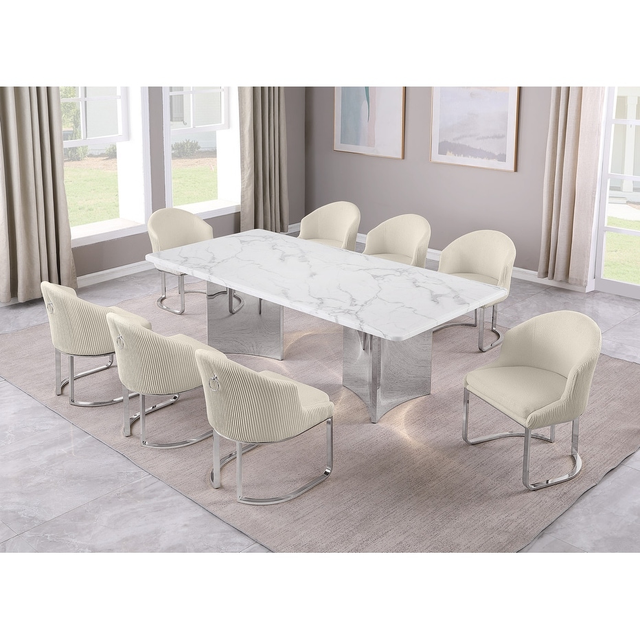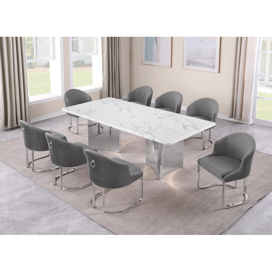Best Quality Furniture 9pc Marble Dining Set Teddy Fabric Chairs