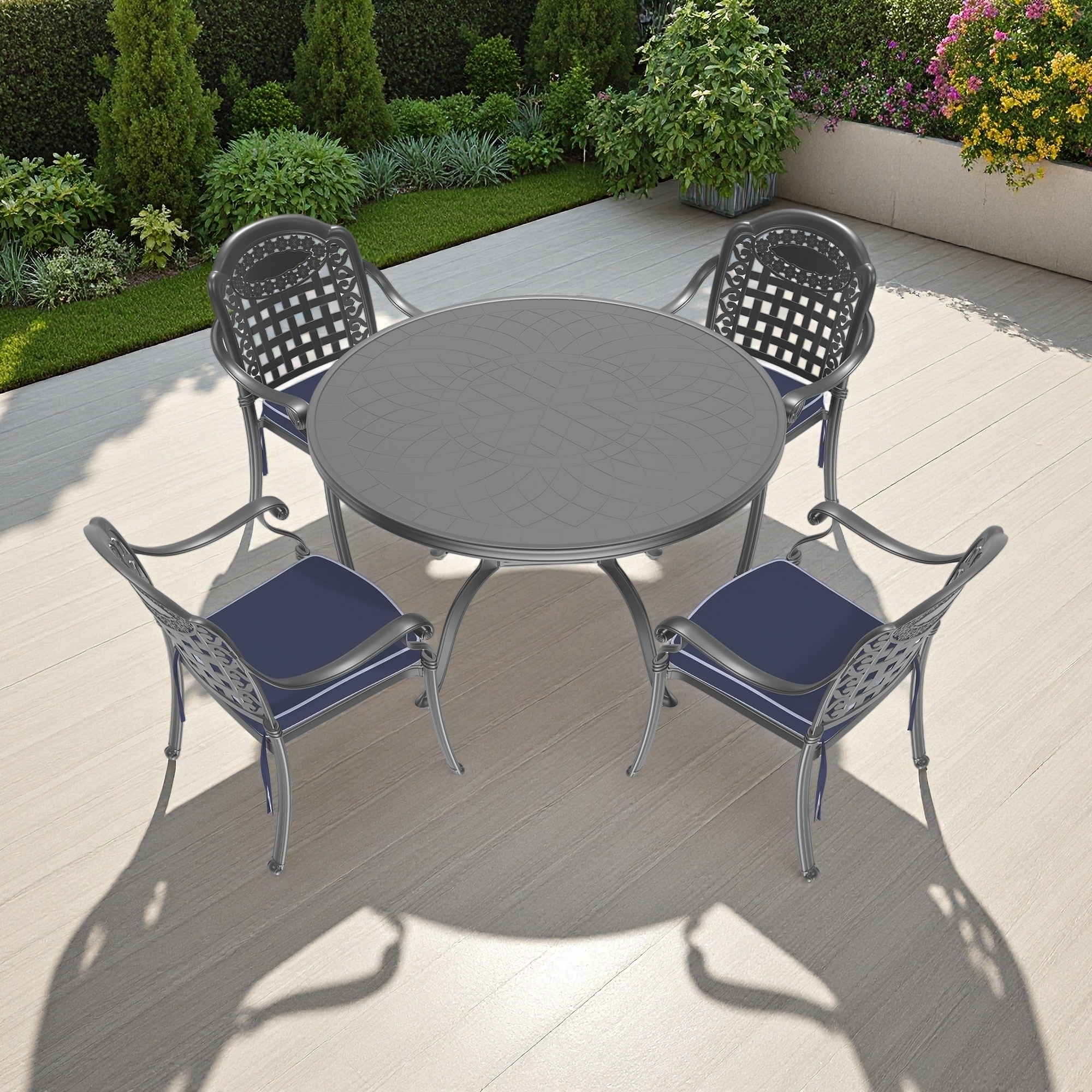 5-Piece Outdoor Patio Aluminum Dining Set with Round Table, Umbrella Hole and 4 Stacking Chairs with Cushions