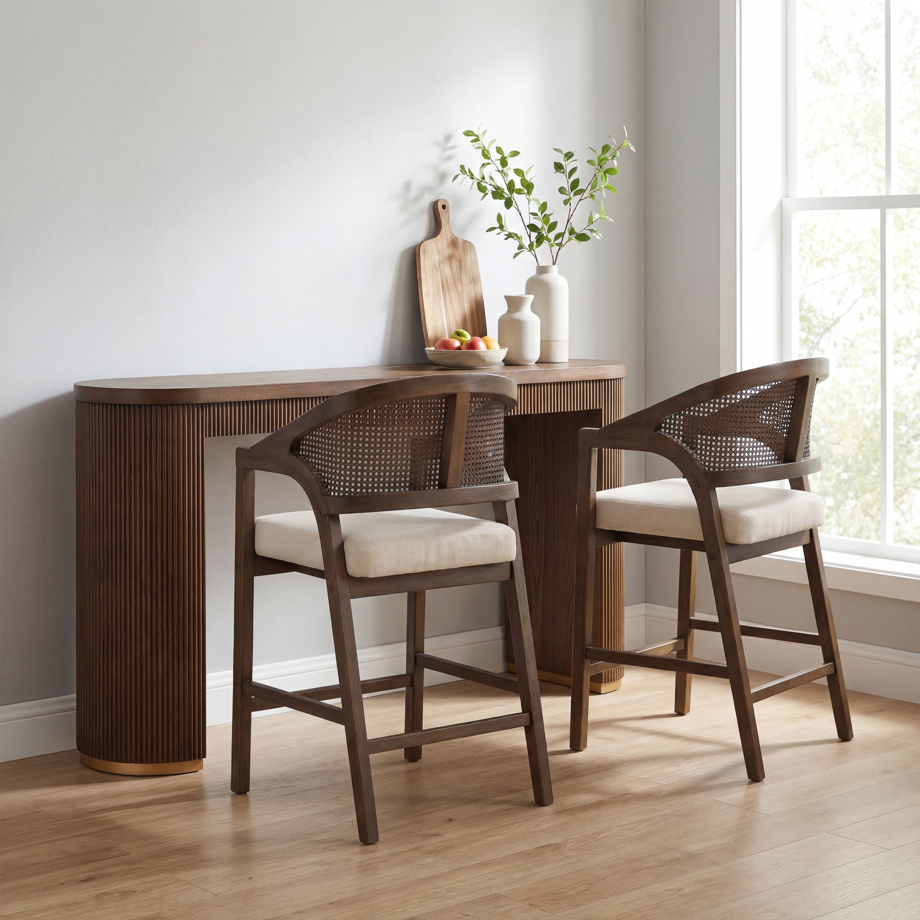 Christopher Knight Home - 3-Piece 34.5" Counter Height Dining Set with Curved Pub Bar Table, Wood Stools & Rattan Back