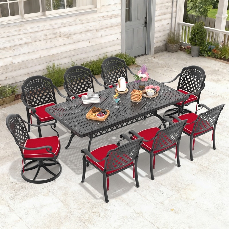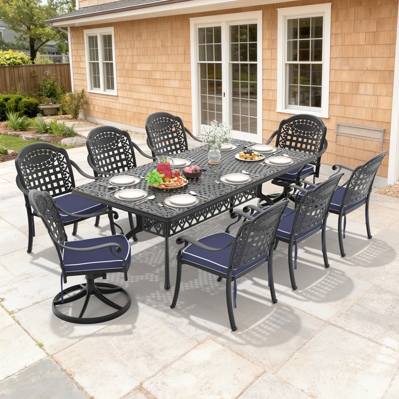 82.68in Black Outdoor Dining Table with 2 Swivel & 6 Stackable Chairs, Cushions(9-Piece Set)