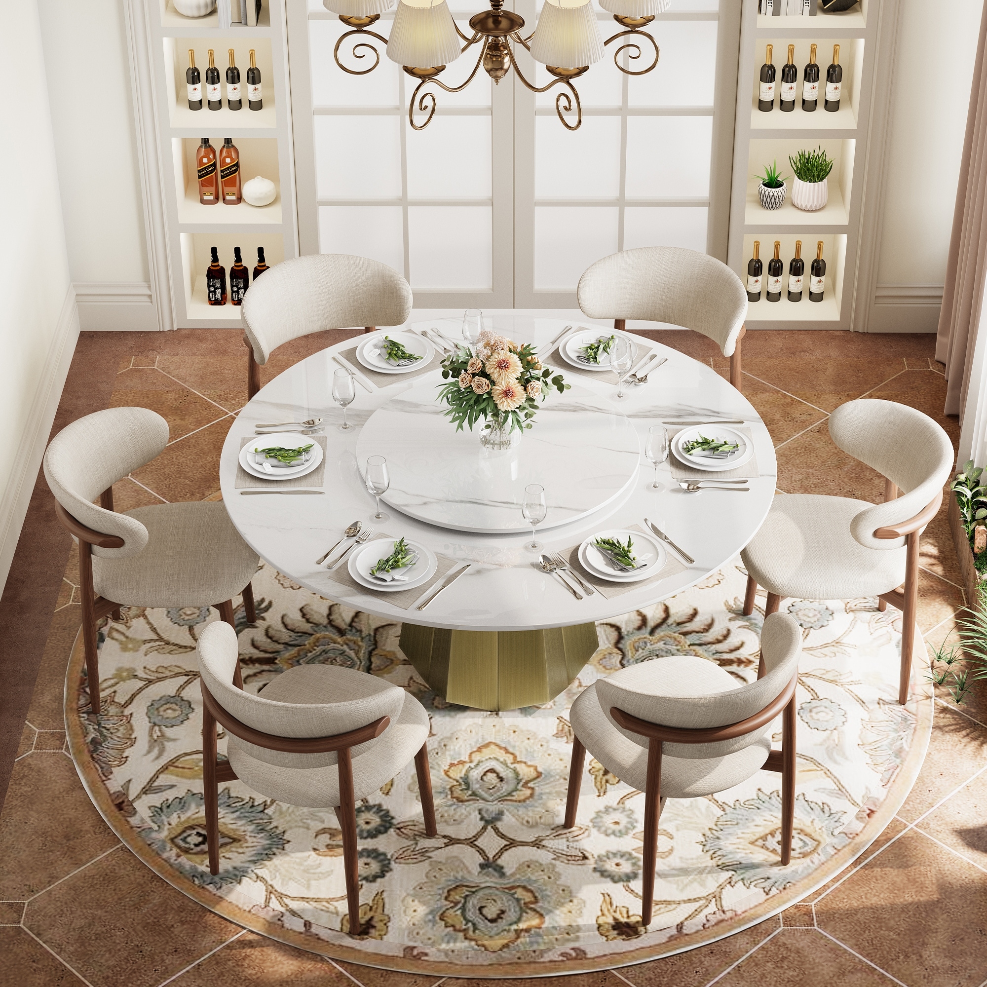 Modern 59" Round Dining Table with Lazy Susan for 6-8, White Glossy Sintered Stone Table top, Gold Stainless Steel Base
