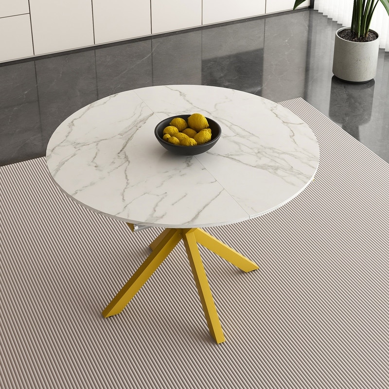 A 42-inch stainless steel white pattern burning stone round table with gold legs Round table suitable for 2, 4 or 6 people