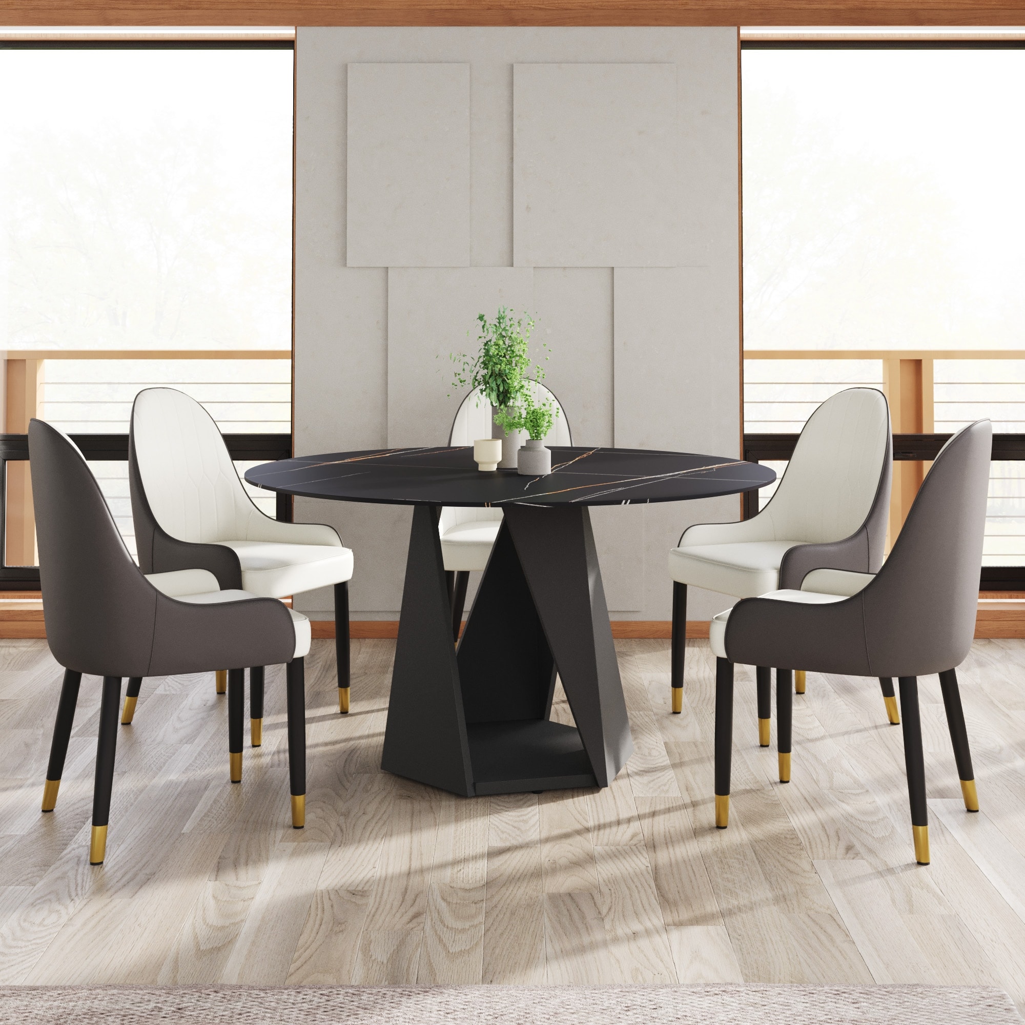 Modern Round Stone Top Black Woodgrain Pedestal Dining Table