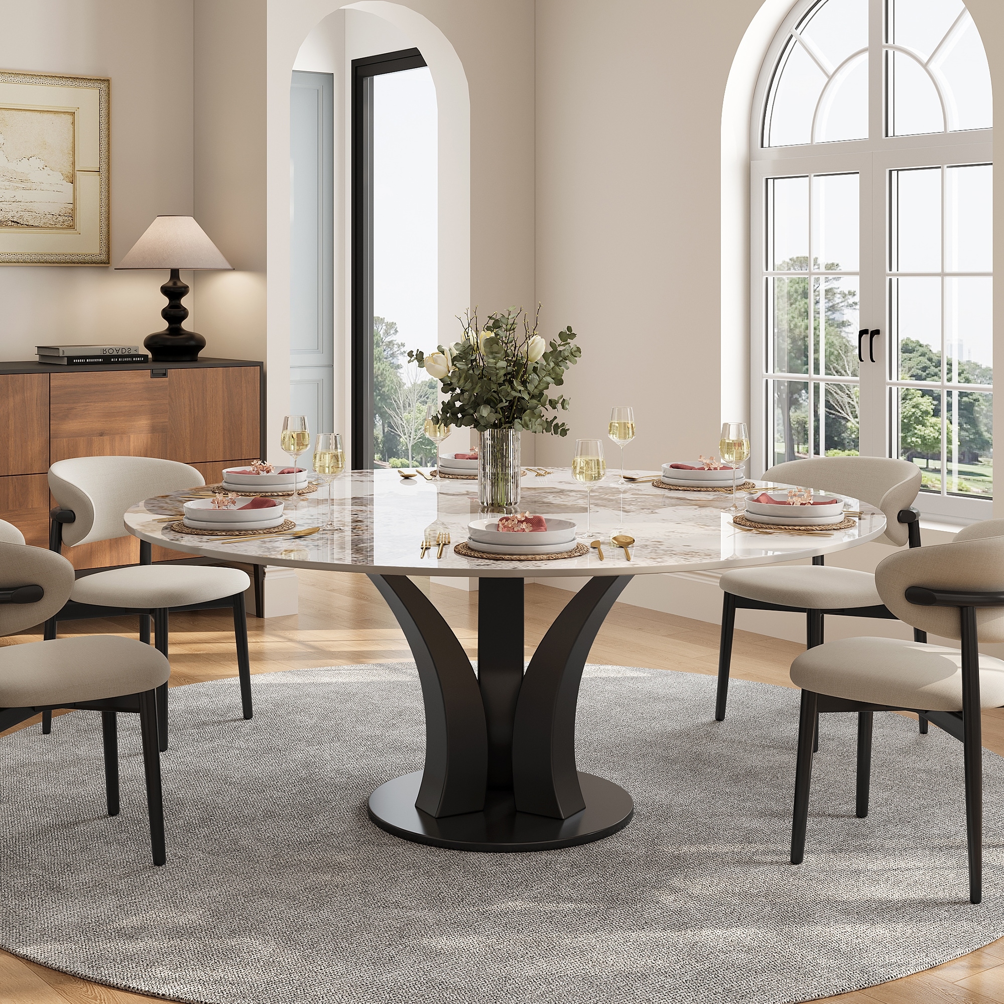 59" Round Sintered Stone Dining Table for 6-8, Glossy Pandora Table top