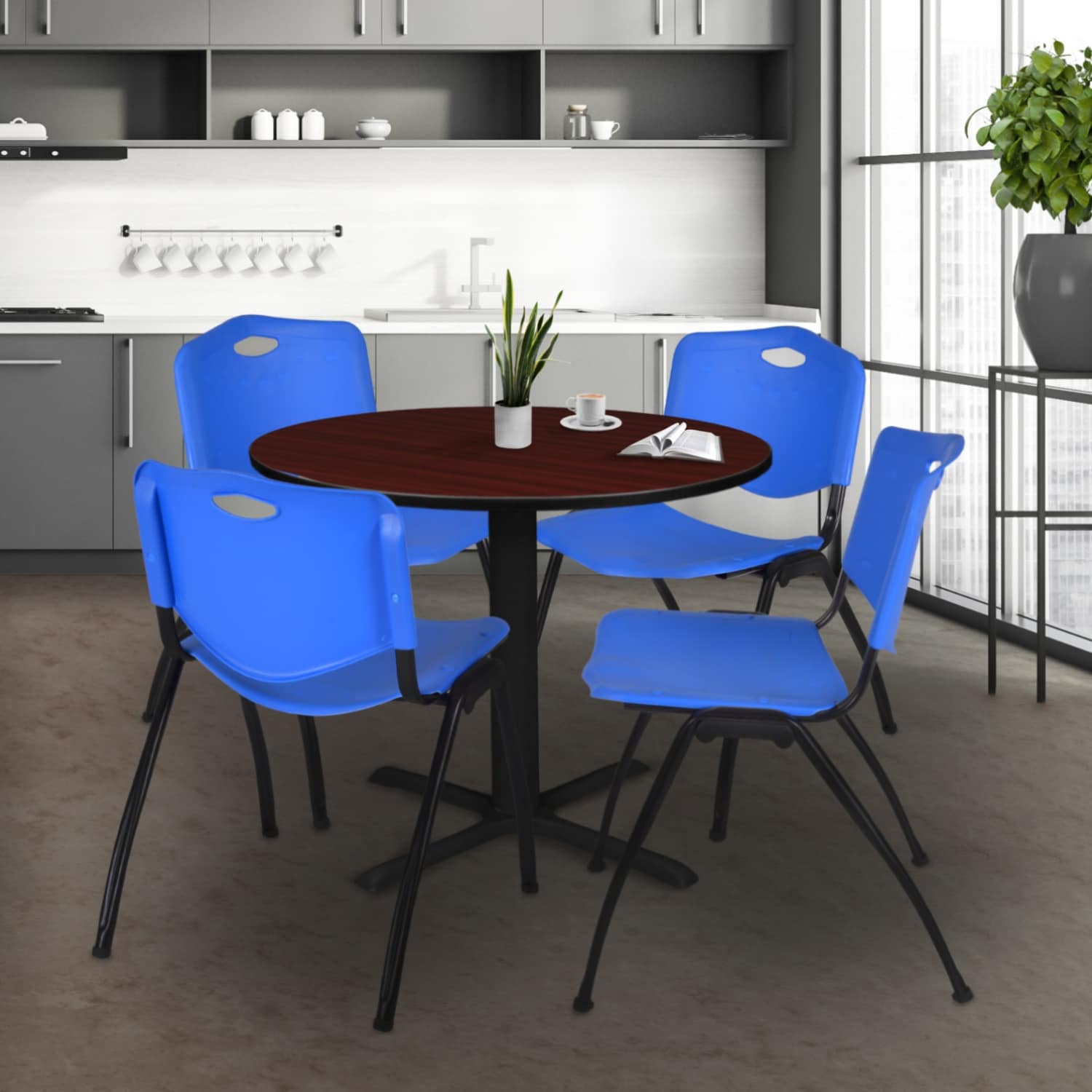 42" Round Breakroom Table- Mahogany & 4 'M' Stack Chairs- Blue - Blue, Mahogany - 42
