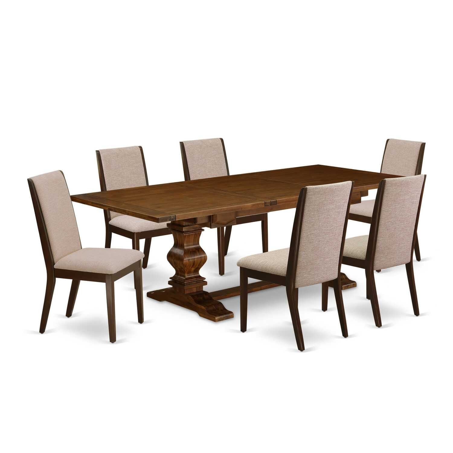 7-Piece Dining Set - Linen Fabric Parsons Chairs & Mid Century Table - Antique Walnut Finish - 92