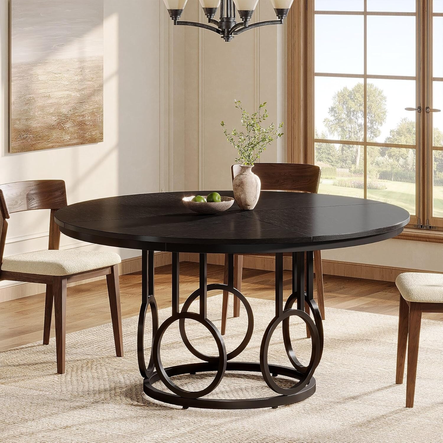 47-Inch Round Wood Dining Table with Metal Base, Seats 4-6, Space-Saving Design for Kitchen & Living Room - Black