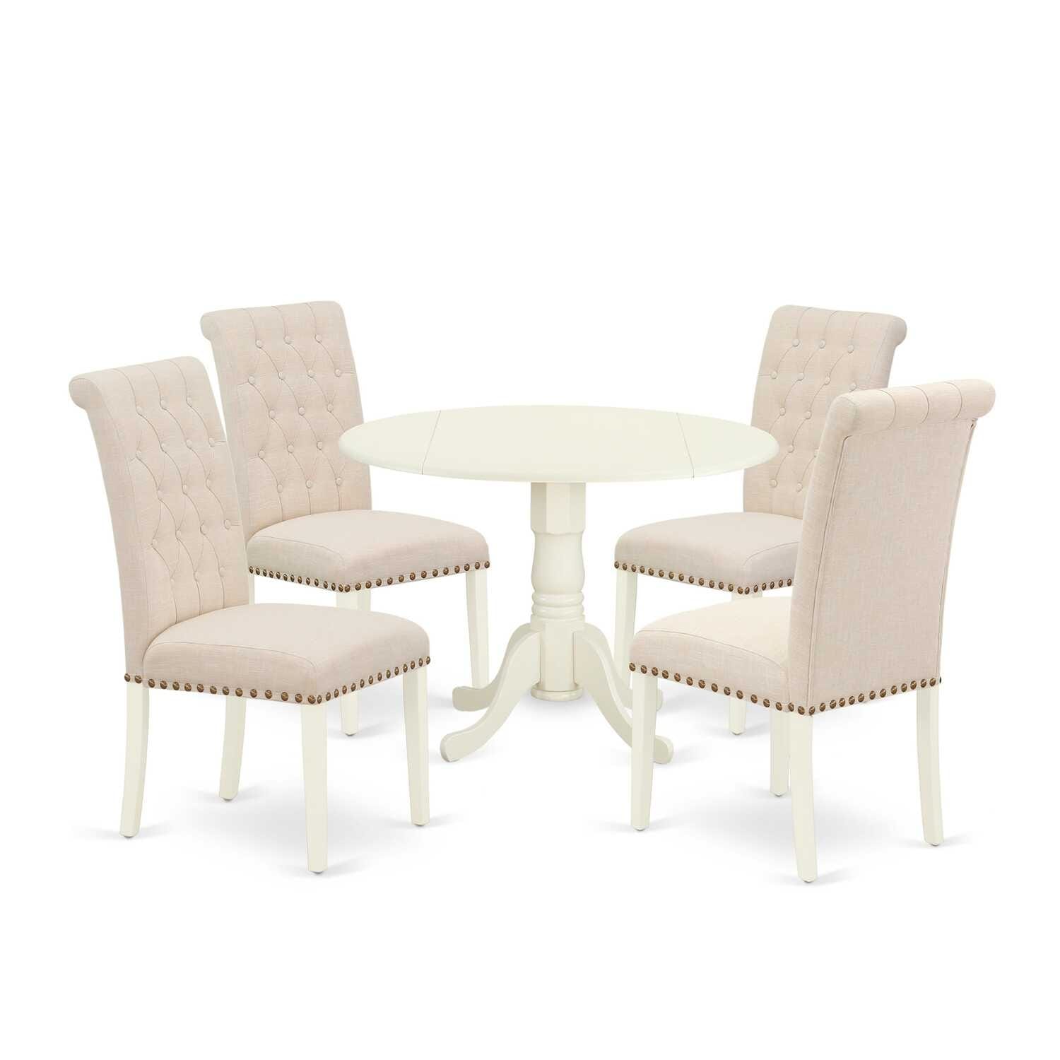 Rustic 5Pc Dinette Set - Round Table & 4 Parsons Chairs - Light Beige Fabric, White Finish - 42
