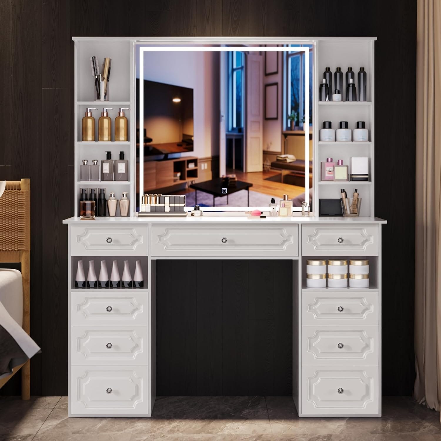 47-inch Lighted Makeup Vanity with Adjustable Brightness, 9 Drawers & 10 Shelves, Dressing Table for Bedroom