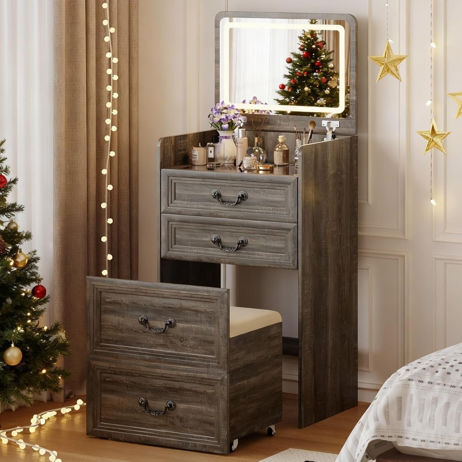 Makeup Vanity Desk with LED Lights, Mirror, Drawers, and Jewelry Storage, Compact Dressing Table for Bedroom