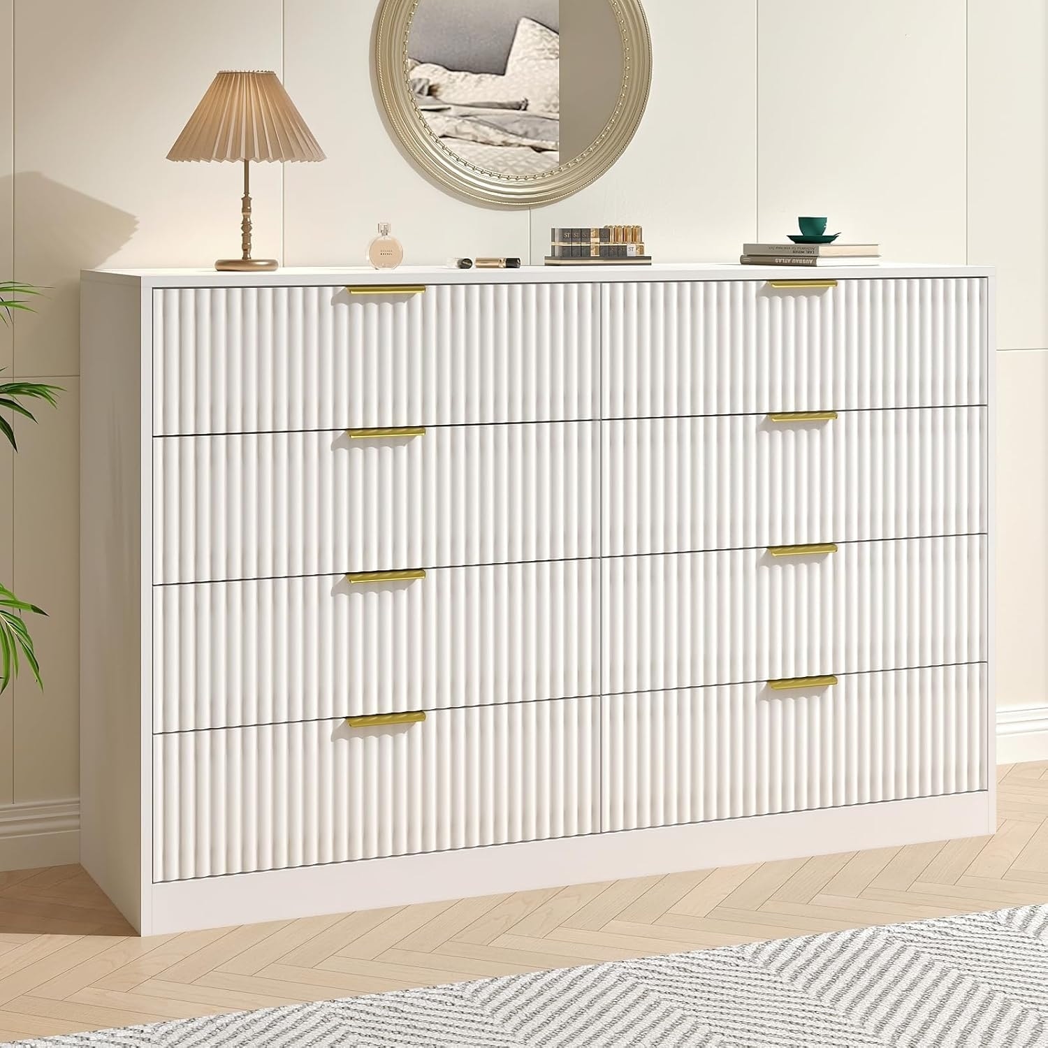55-inch White Fluted Dresser with 8 Drawers, Gold Handles, Wood TV Stand for Bedroom, Living Room