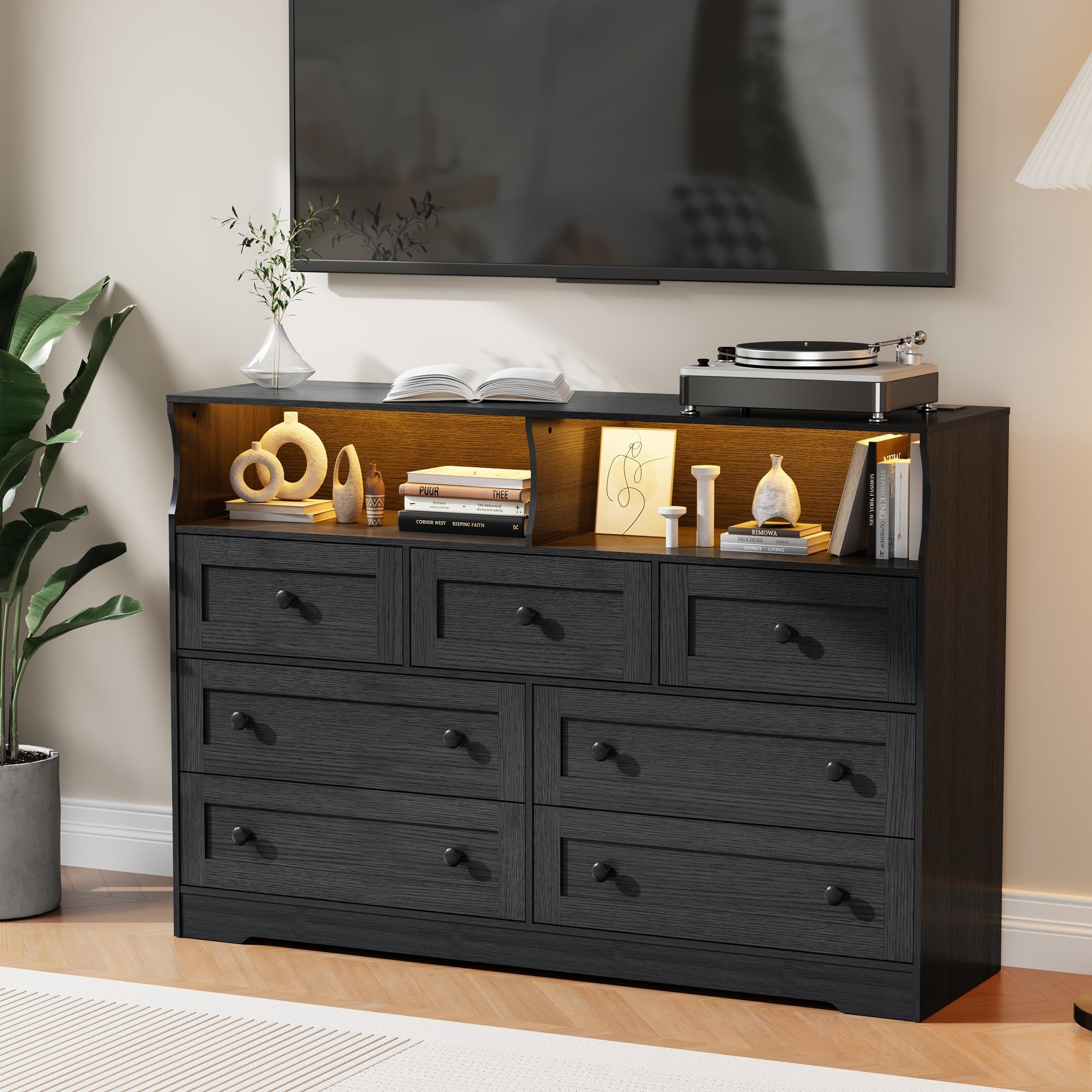 7 Drawer Dresser with LED Lights & Charging Station, Wood Storage Chest with Open Shelves