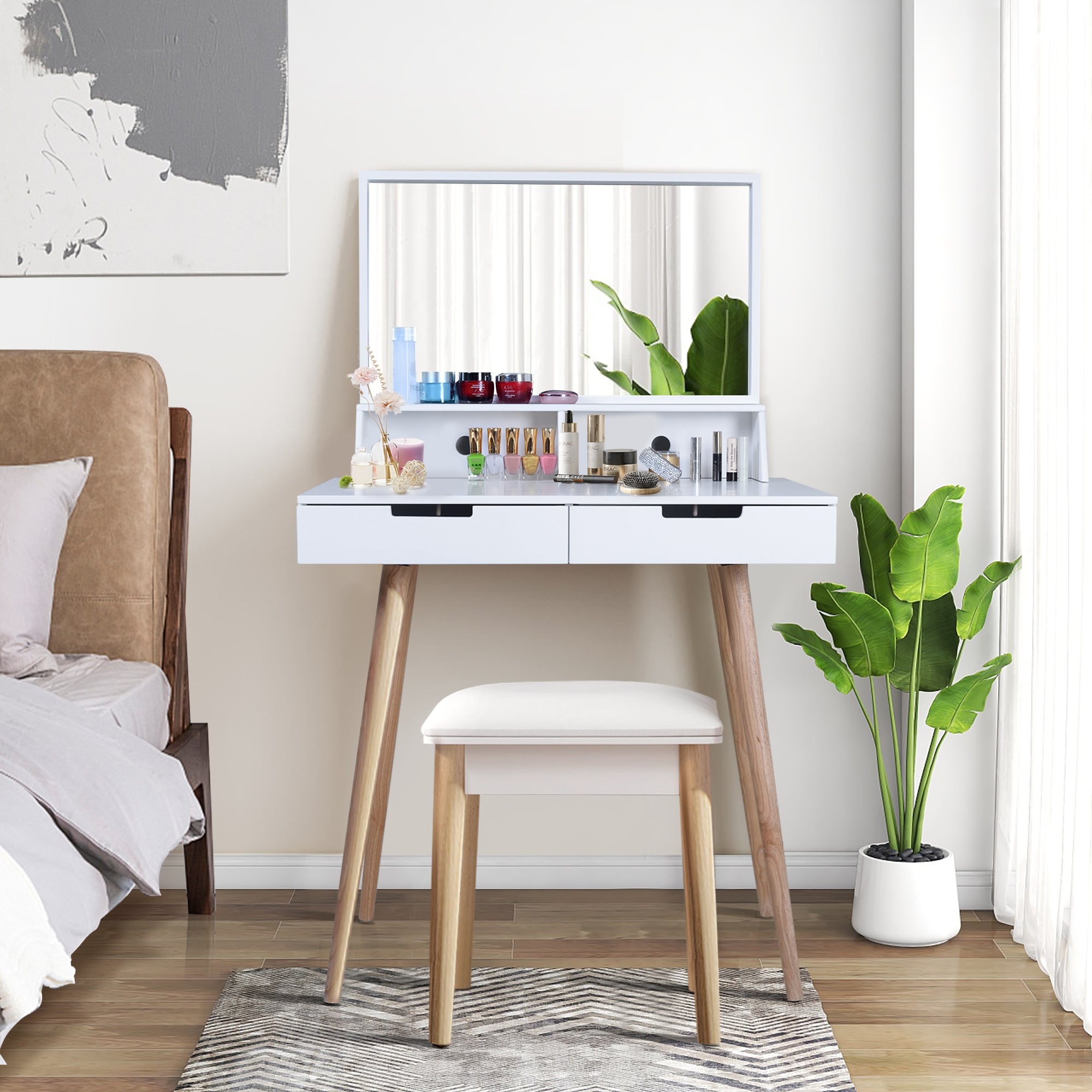 37" Middle Size Left Drawer Desktop Vanity Table + Cushioned Stool,Large Right sliding mirror, Multi Layer High Capacity Storage