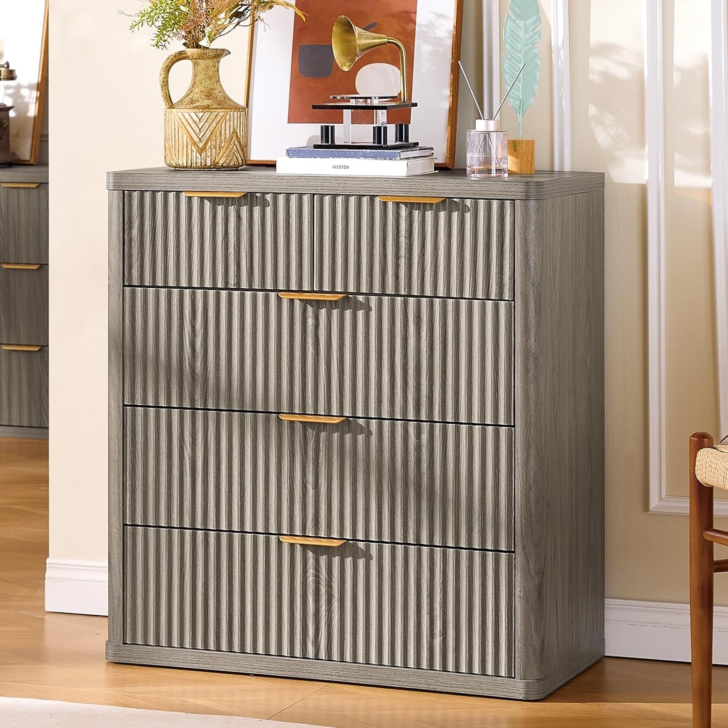Modern 5-Drawer Fluted Dresser with Metal Handles, Grey Wood Finish, Ideal for Bedroom, Living Room, or Entryway