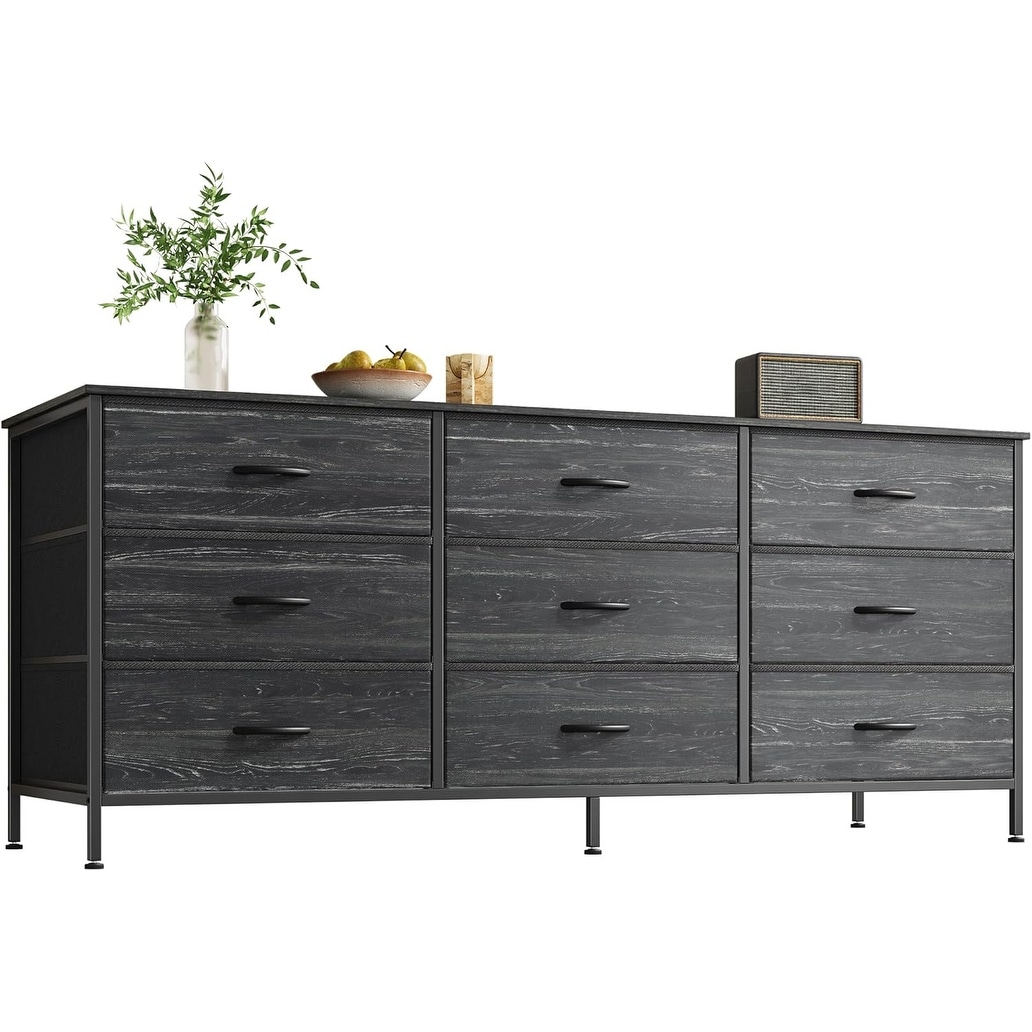 55 Inch TV Stand with 9 Fabric Drawers, Large Storage Dresser for Bedroom, Charcoal Black Wood Grain
