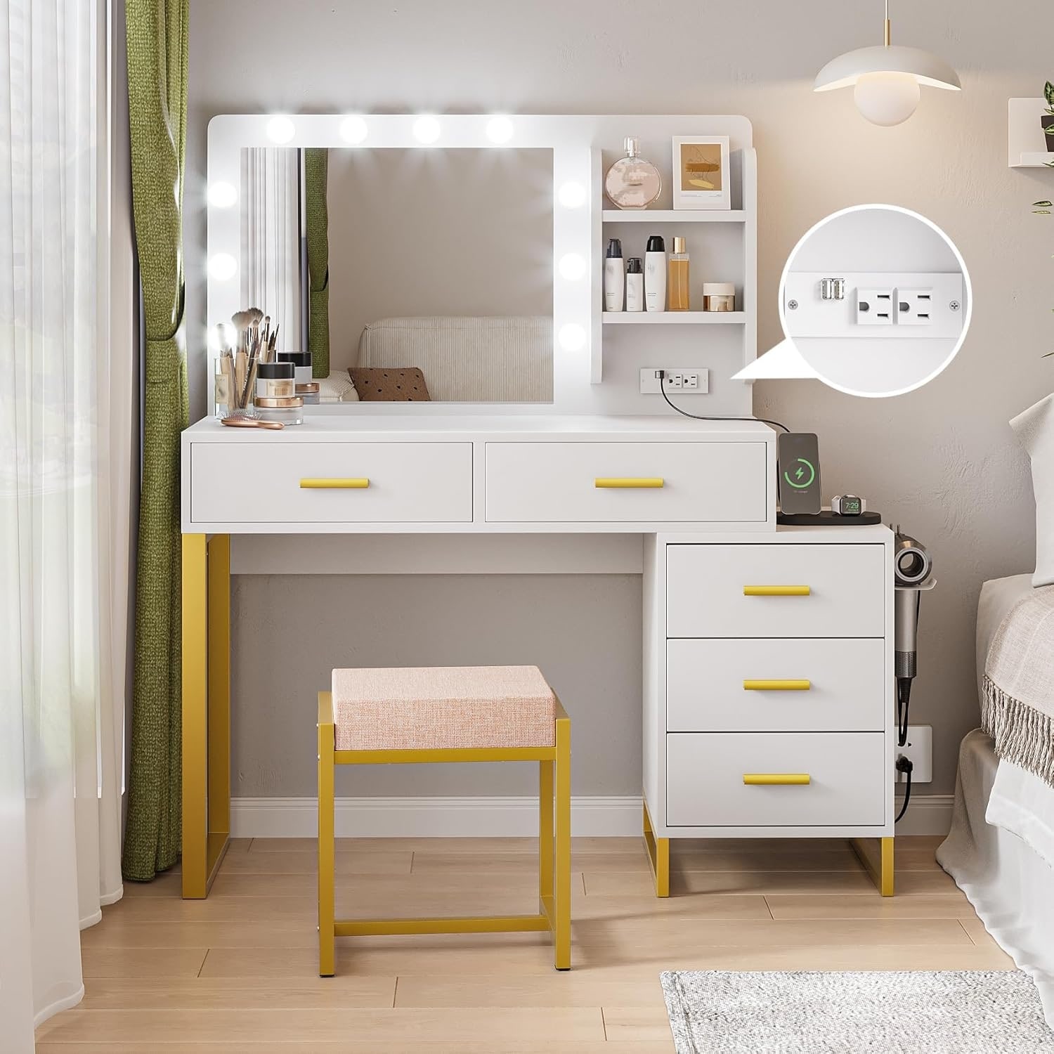 Makeup Vanity Desk with Mirror, Lights, Power Outlet, Shelves, Drawers, and Adjustable Brightness - White