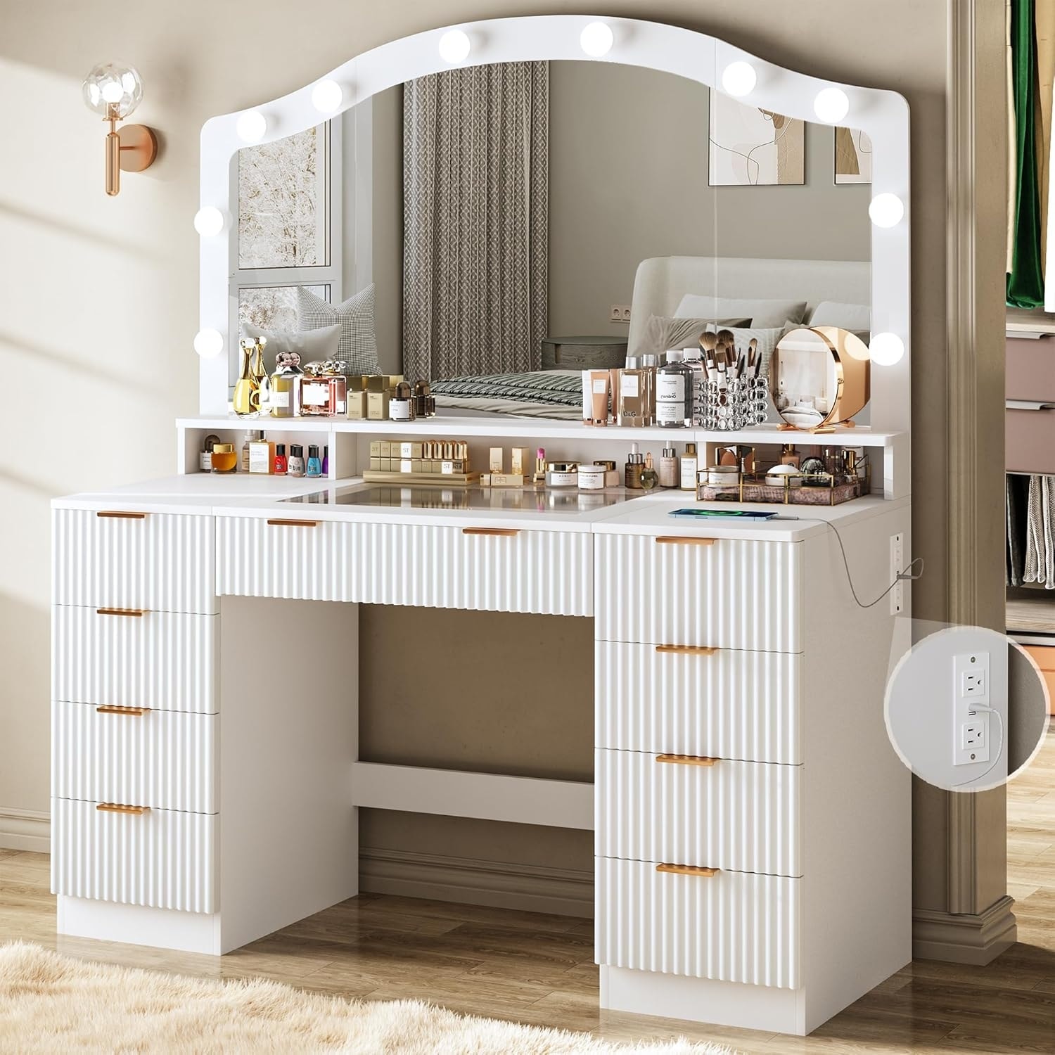 46-inch Fluted Vanity Desk with Large Mirror, Adjustable Lighting, Glass Top, and 9 Drawers