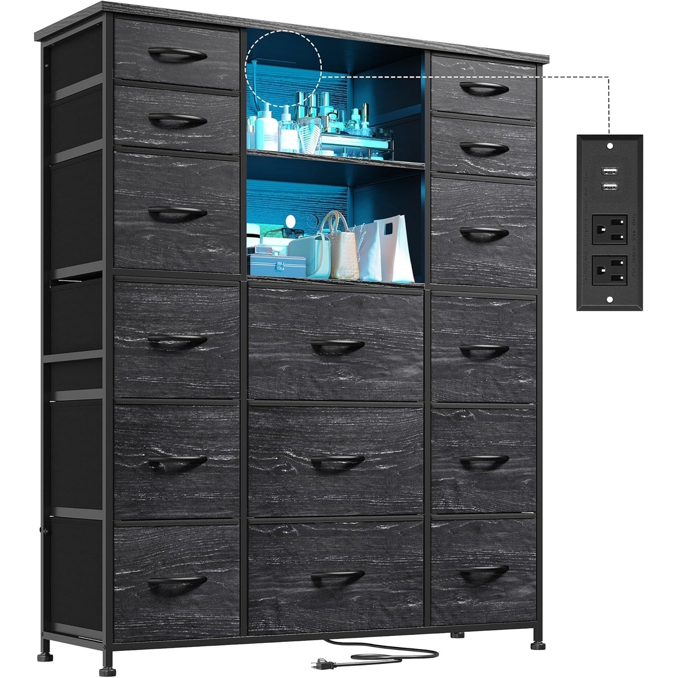 51 Inch H Dresser with 15 Drawers, Charging Station & LED Lights, Sturdy Black Design