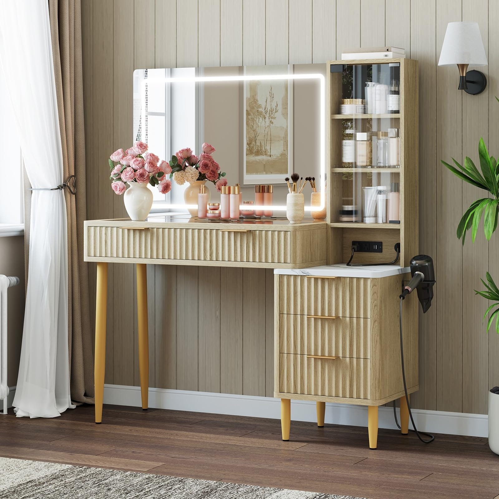 Vanity Desk with multi-layer storage and drawers,with hair dryer holder