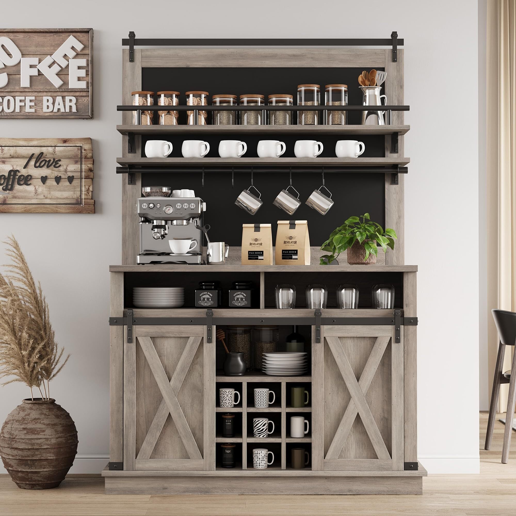 75" Tall Coffee Hutch Cabinet, Farmhouse Kitchen Buffet Sideboard with Hooks and Sliding Barn Door