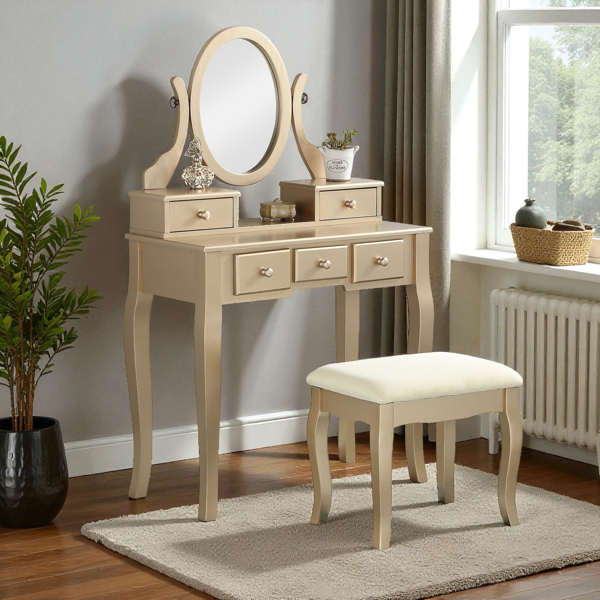 Wood Makeup Vanity Table with Mirror and Stool Set, Dressing Table with 5 Drawers and Adjustable Oval Mirror