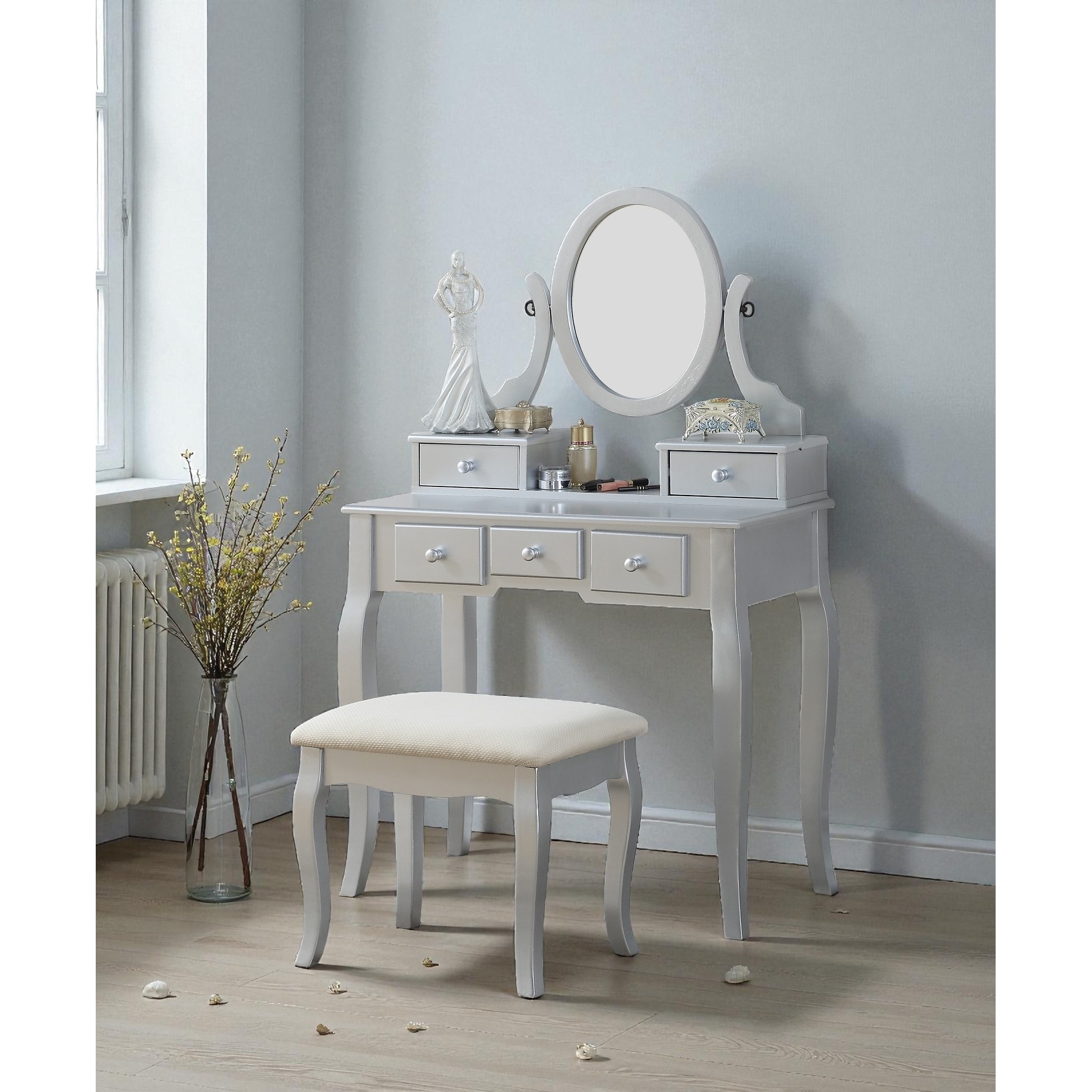 Wood Makeup Vanity Table with Mirror and Stool Set, Dressing Table with 5 Drawers and Adjustable Oval Mirror