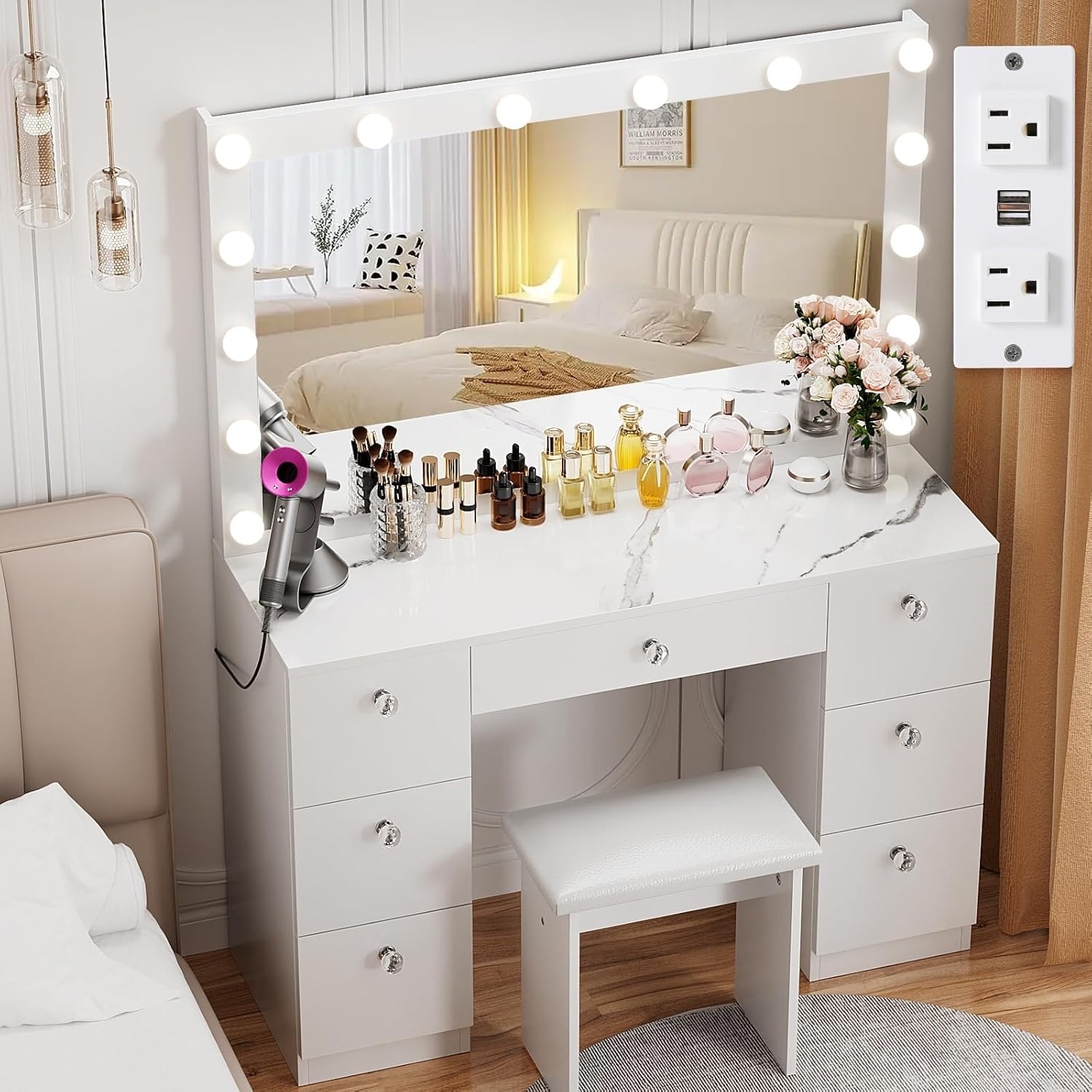 Makeup Vanity Desk with Lighted Mirror, Power Outlet, 7 Drawers, Adjustable Lighting, 44 inch with Stool, Marble Finish
