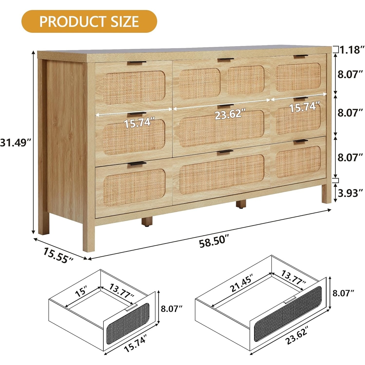 Modern 9-Drawer Rattan Dresser with Large Storage, Rustic Wood Chest for Bedroom, Living Room, Entryway