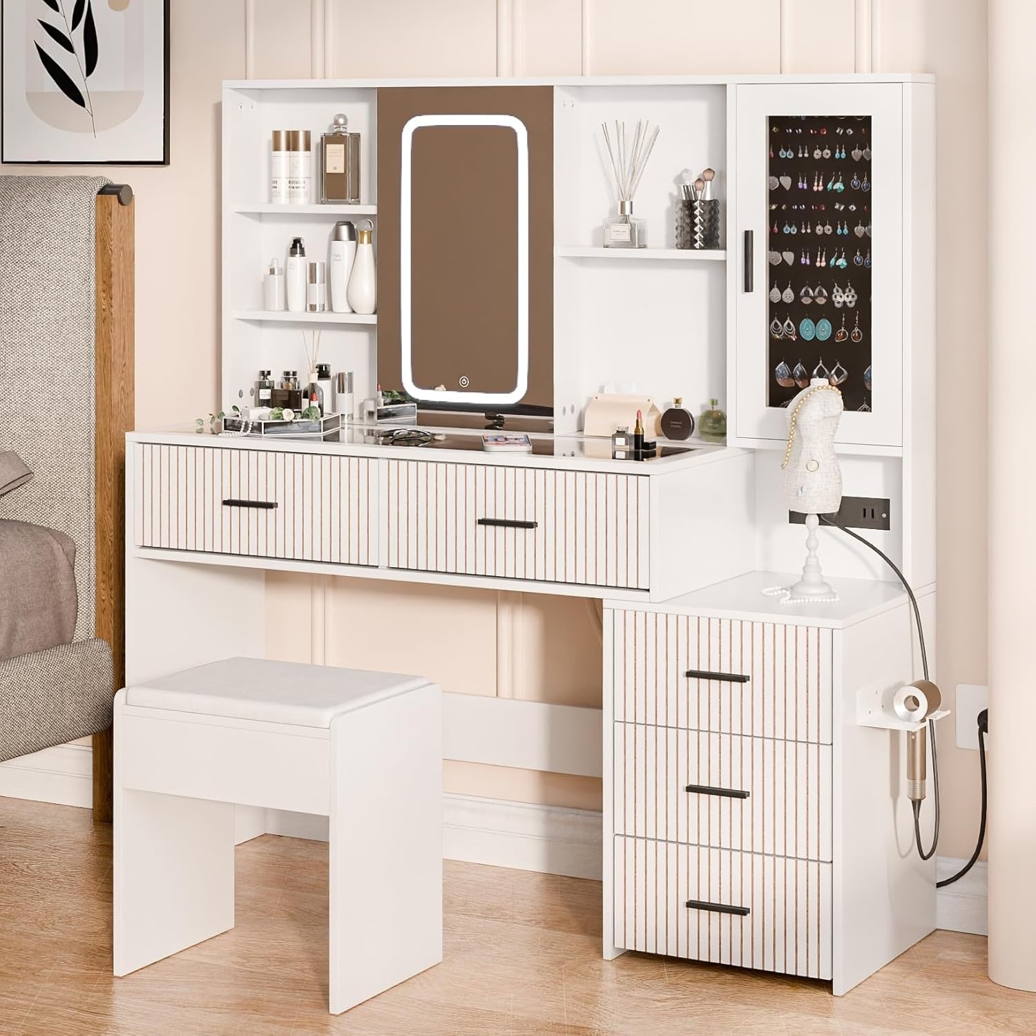 L-Shape Makeup Vanity Desk with LED Mirror, 6 Drawers, Jewelry Storage, and Charging Station