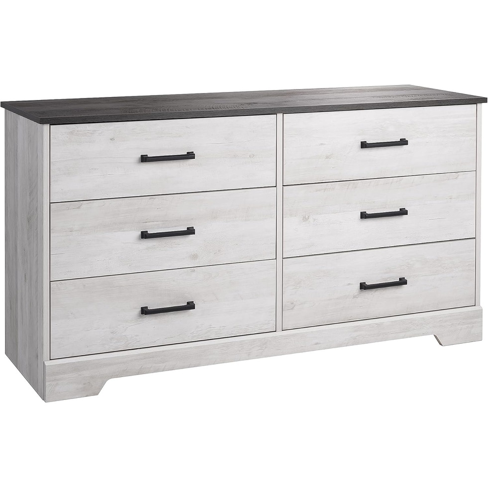 Farmhouse 6-Drawer Double Dresser, Washed White, 53.25"W x 18.25"D x 28.5"H, Ideal for Bedroom Storage