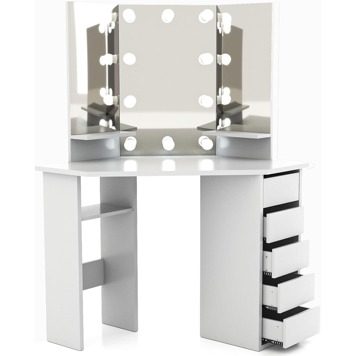Corner Makeup Vanity Desk with Mirror, Lights, and Storage Shelf, White
