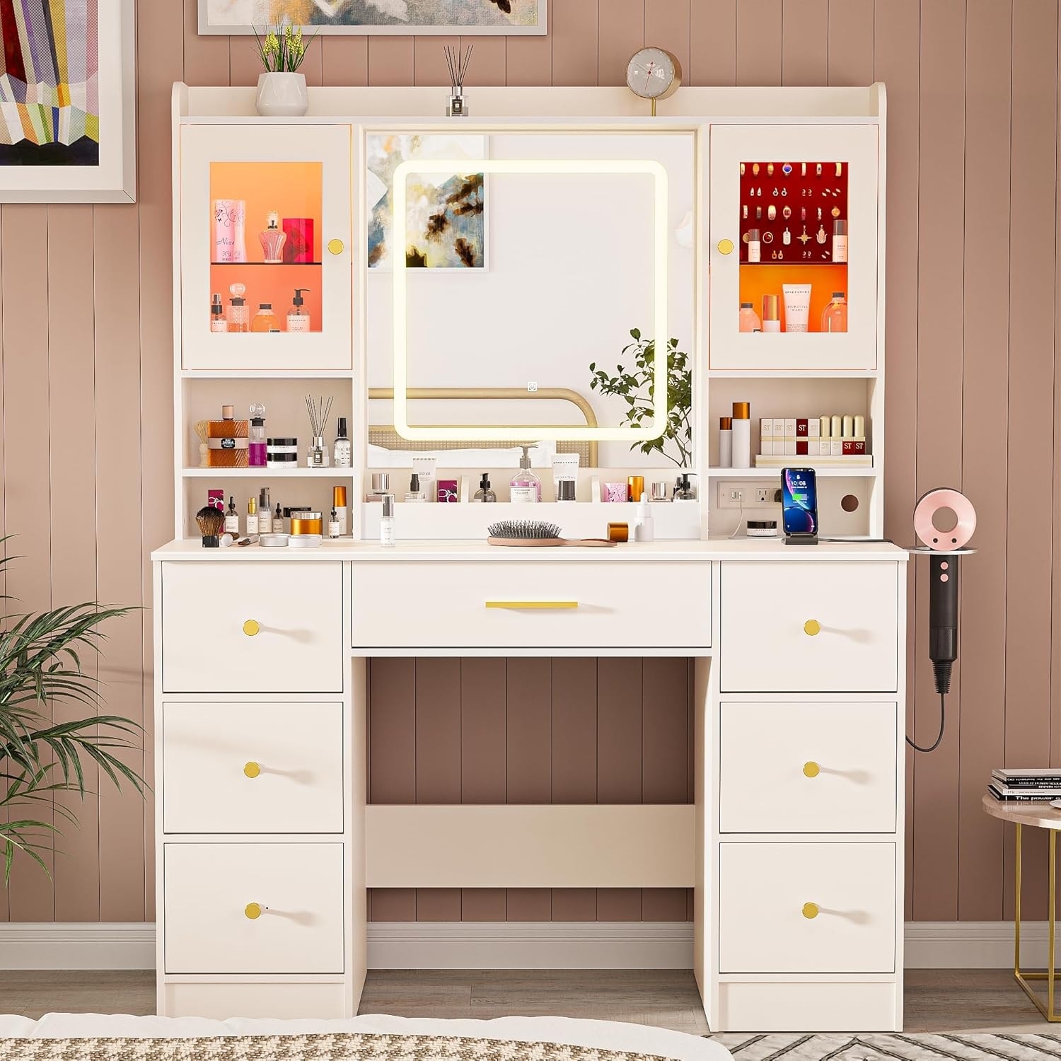 White Large Makeup Vanity Desk with LED Mirror, 7 Drawers, Jewelry Cabinet, and Charging Station