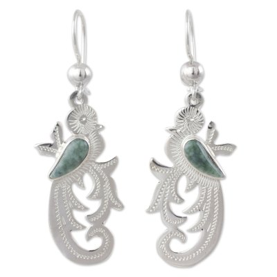 Forest Quetzal,'Hand Crafted Sterling Silver Bird Earrings with Jade Wing'