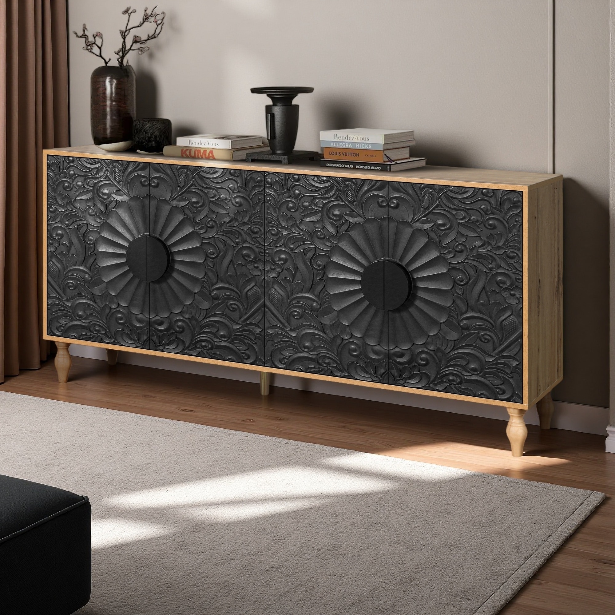 71" Mid Century TV Stands, Solid Wood Veneer, Fully Assembled Media Console, 4 Cabinets