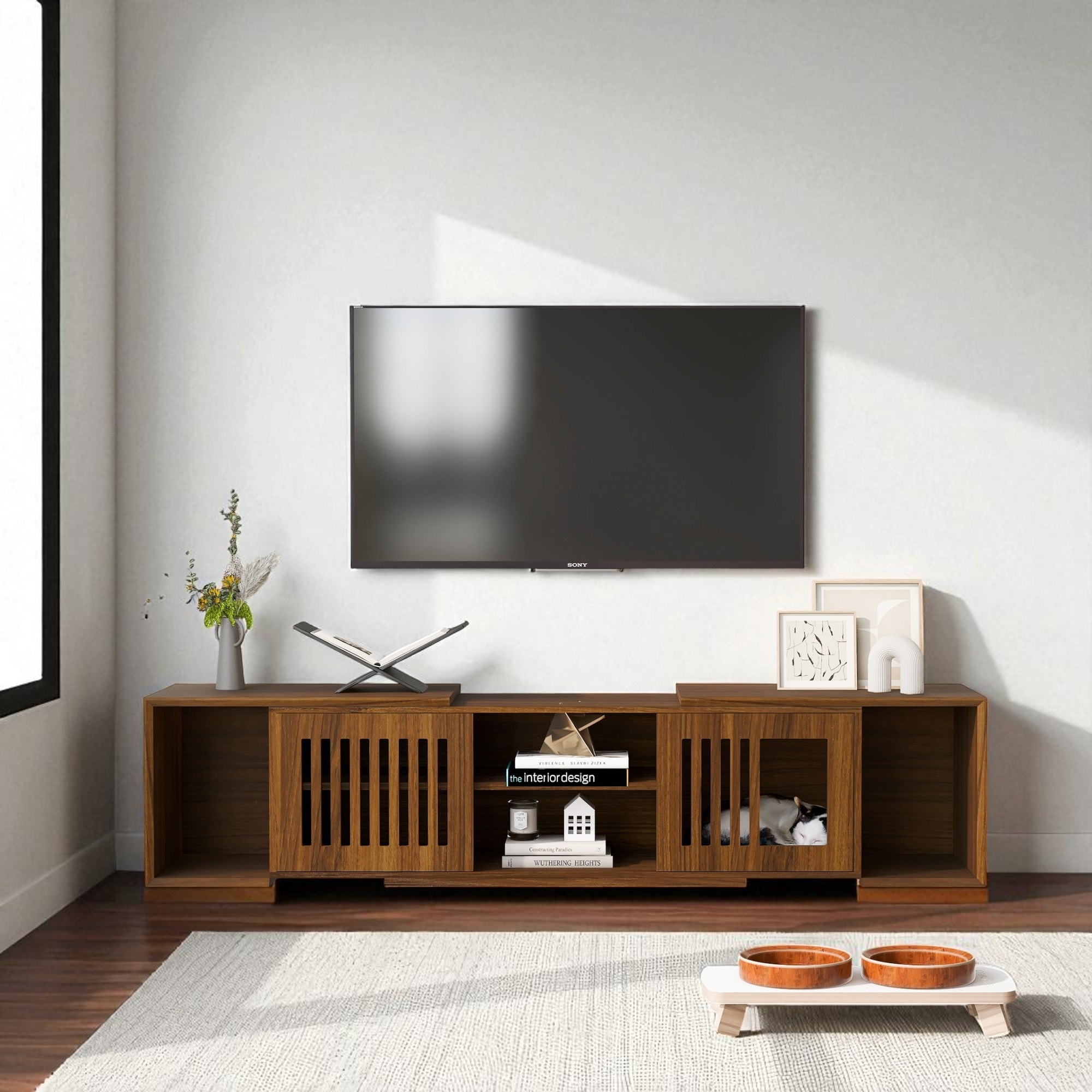 Mid-Century Modern Extendable TV Stand with Cat House & Litter Box Enclosure, Walnut Entertainment Center with Sliding Doors