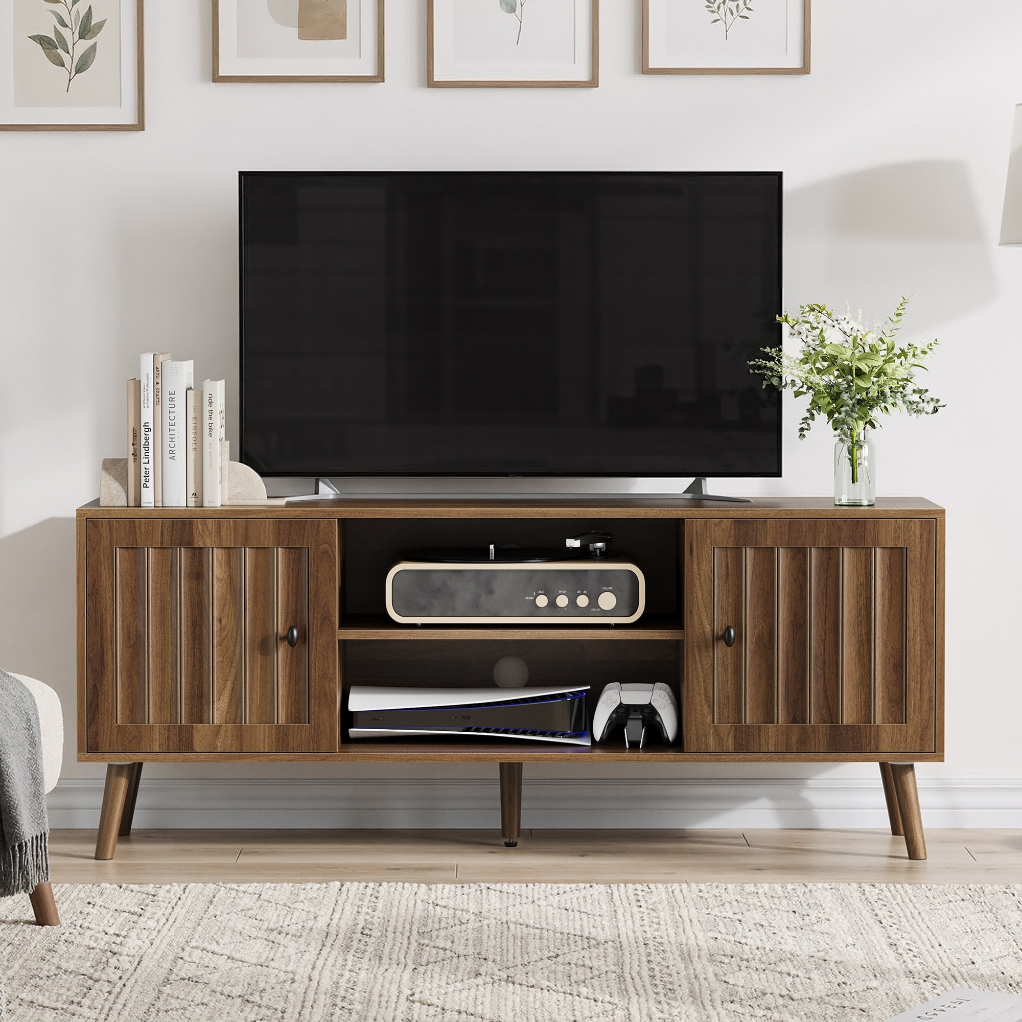 55-Inch Wooden TV Cabinet With 2 Vertical Groove Doors, Adjustable Storage Shelves, Living Room Storage Cabinet