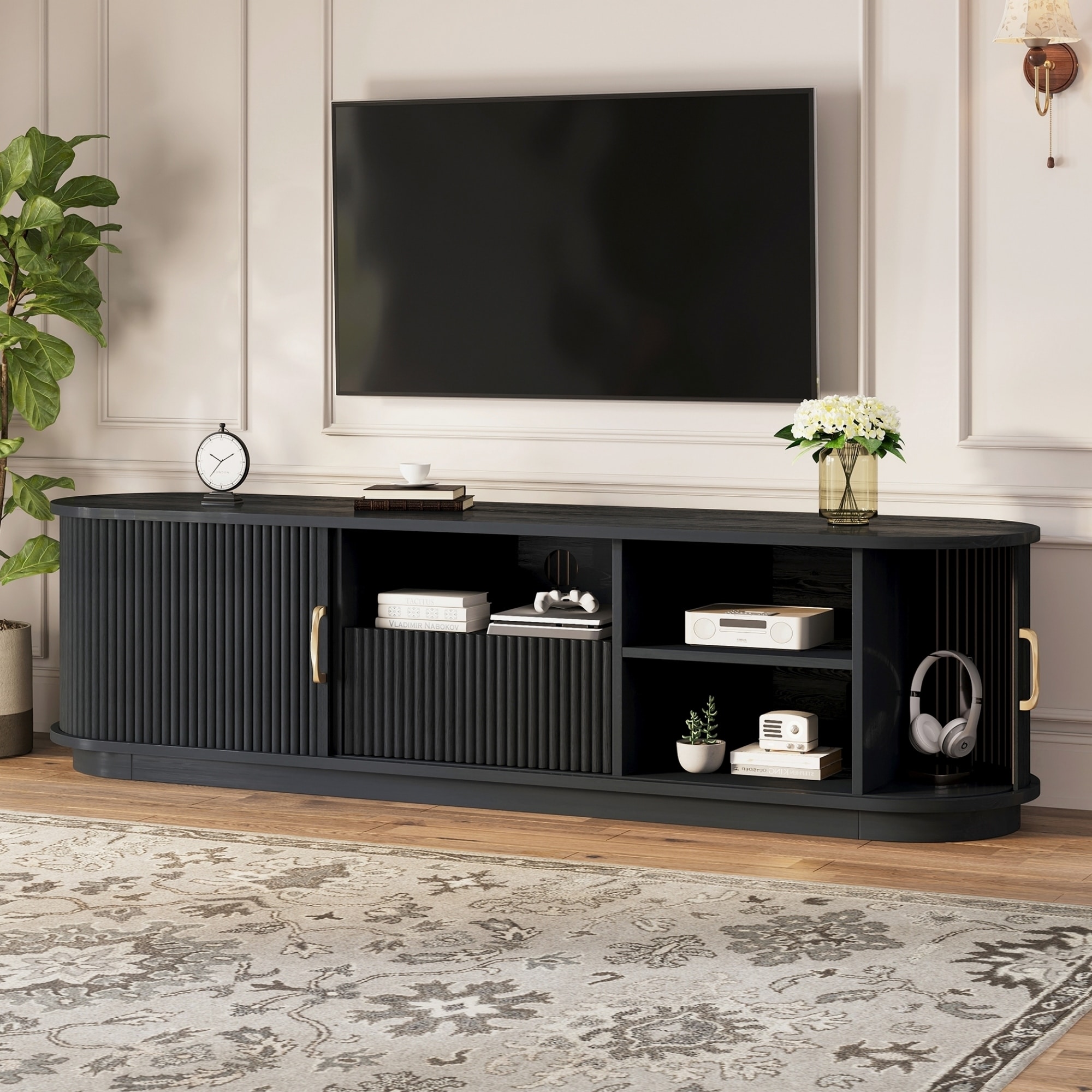 Mid-Century Modern TV Stand with Slatted Grille Striped Doors