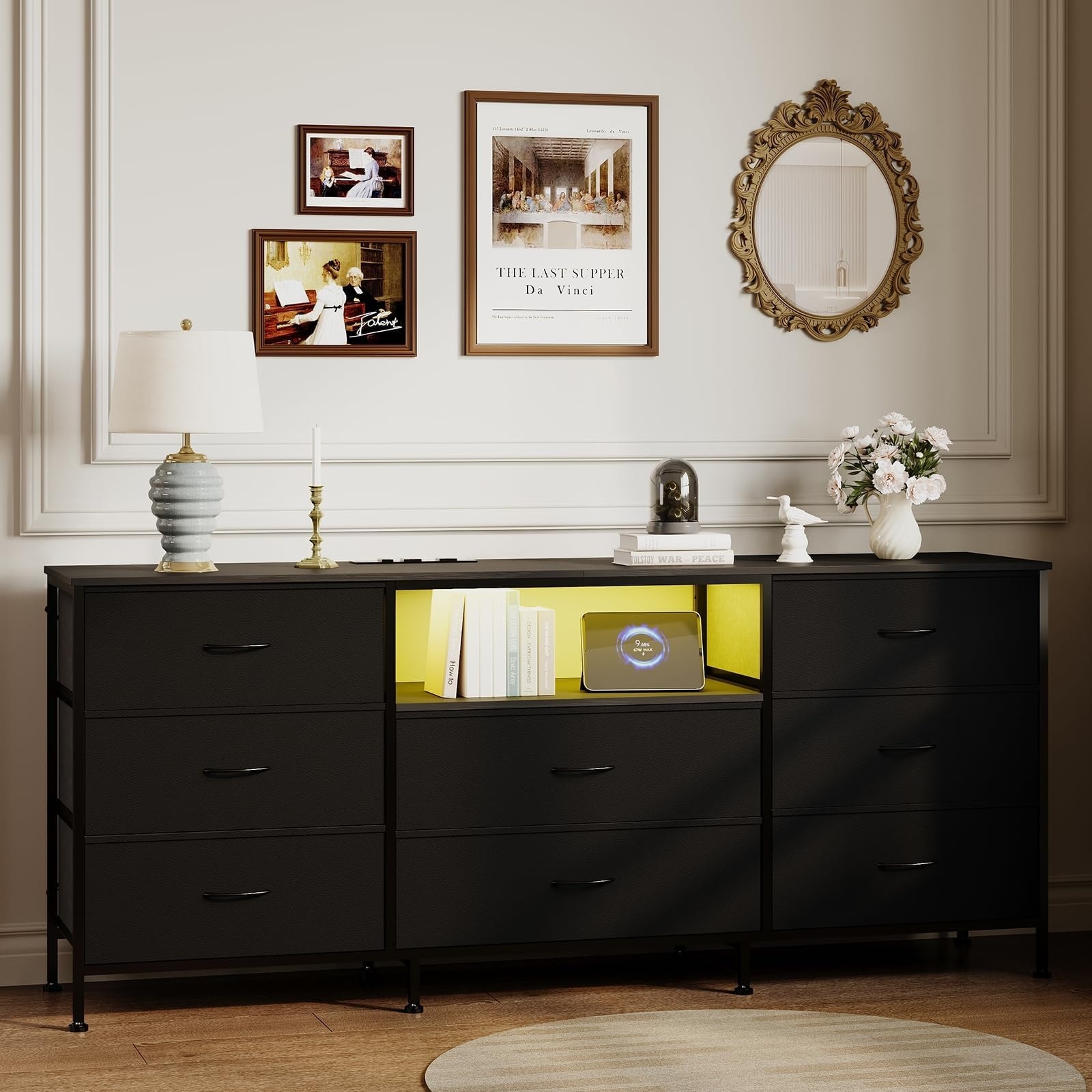 63" LED TV Stand Dresser with 8 Fabric Drawers for TVs up to 75", Media Console with Steel Frame Storage