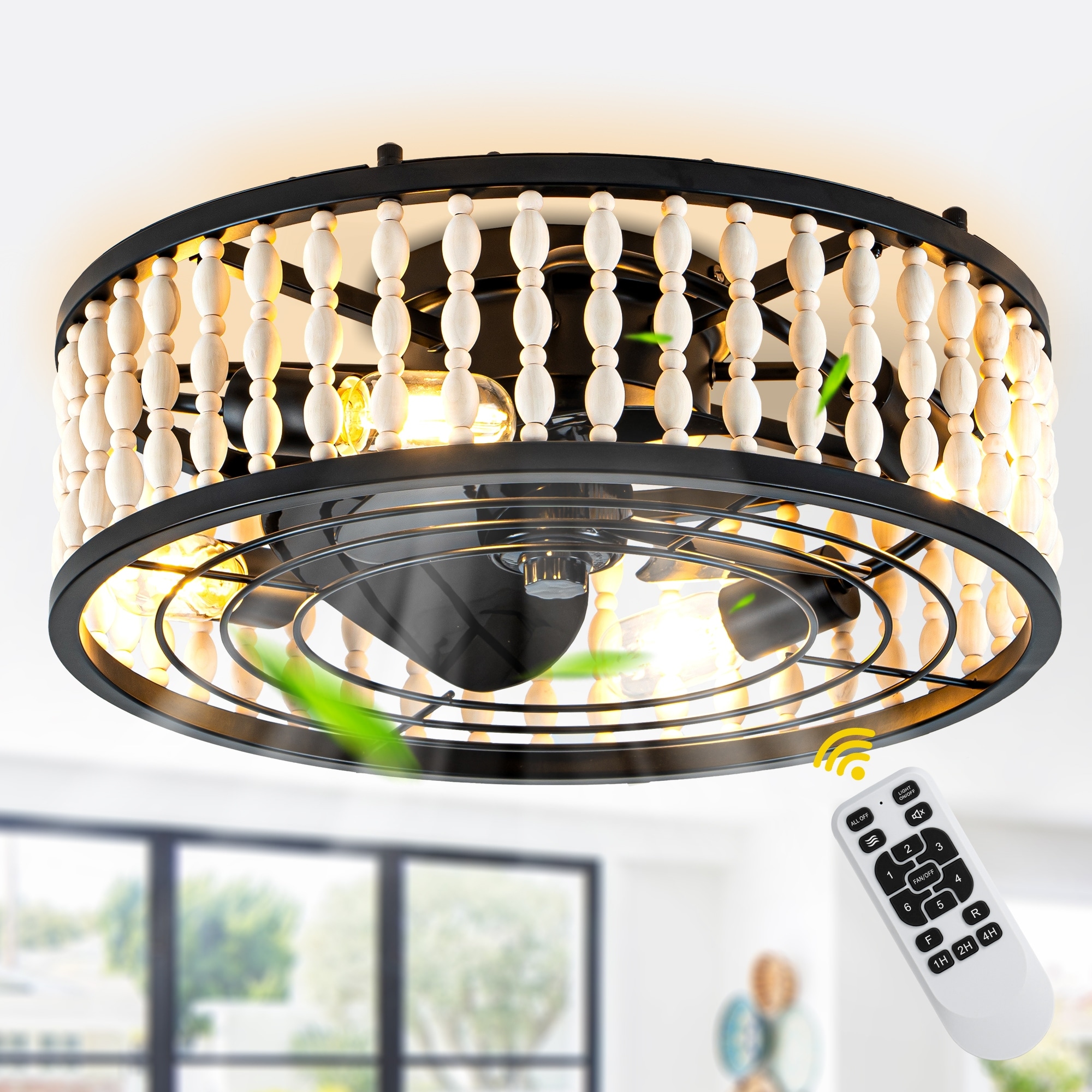 Oaks Aura 19" Farmhouse Bohemian Flush Mount Ceiling Fan with Lights and Remote, Bladeless Ceiling Fan with Wood Beaded Shade.