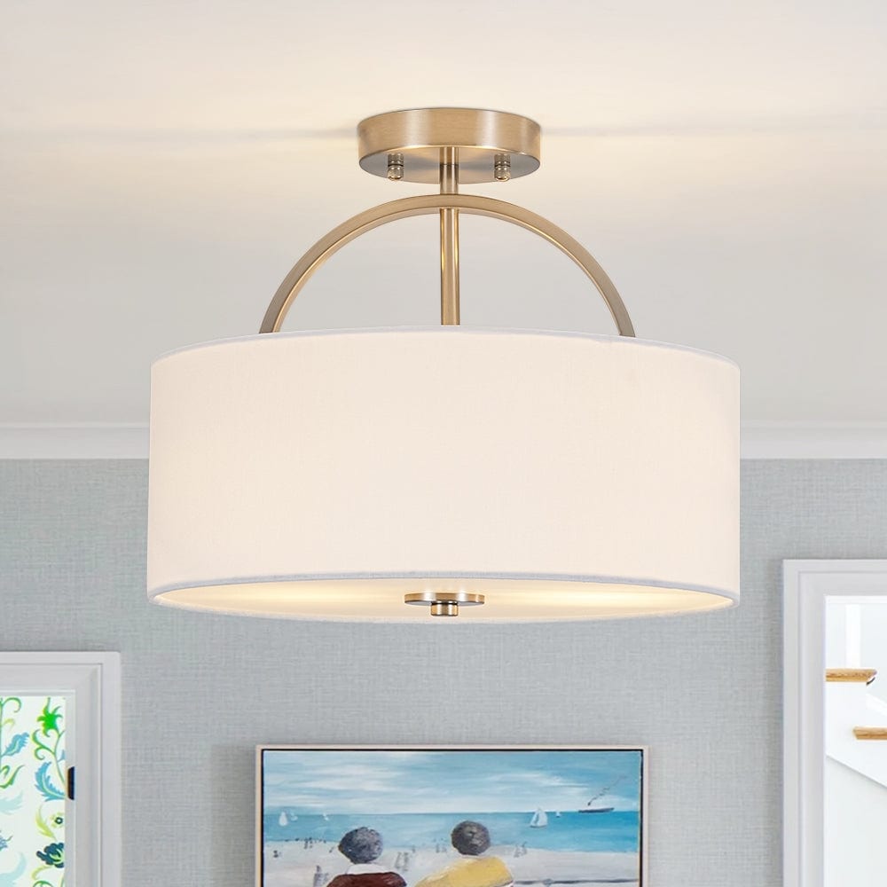 Contemporary 2-Light White Linen Drum Semi Flush Light 15in Wide