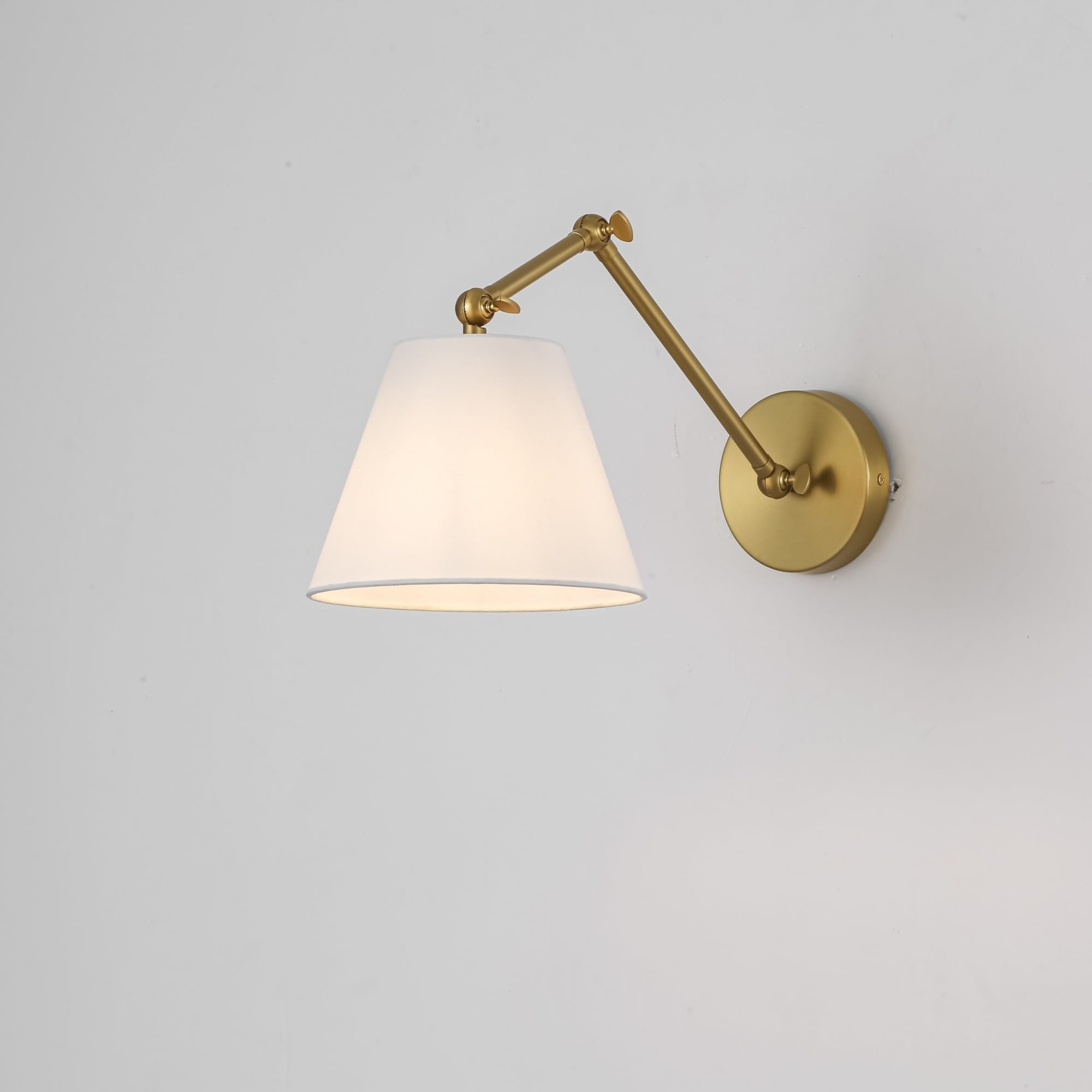1-Light Modern Brushed Gold Adjustable Swing Arm Wall Sconce with Cone Fabric Shade for Bedroom, Study