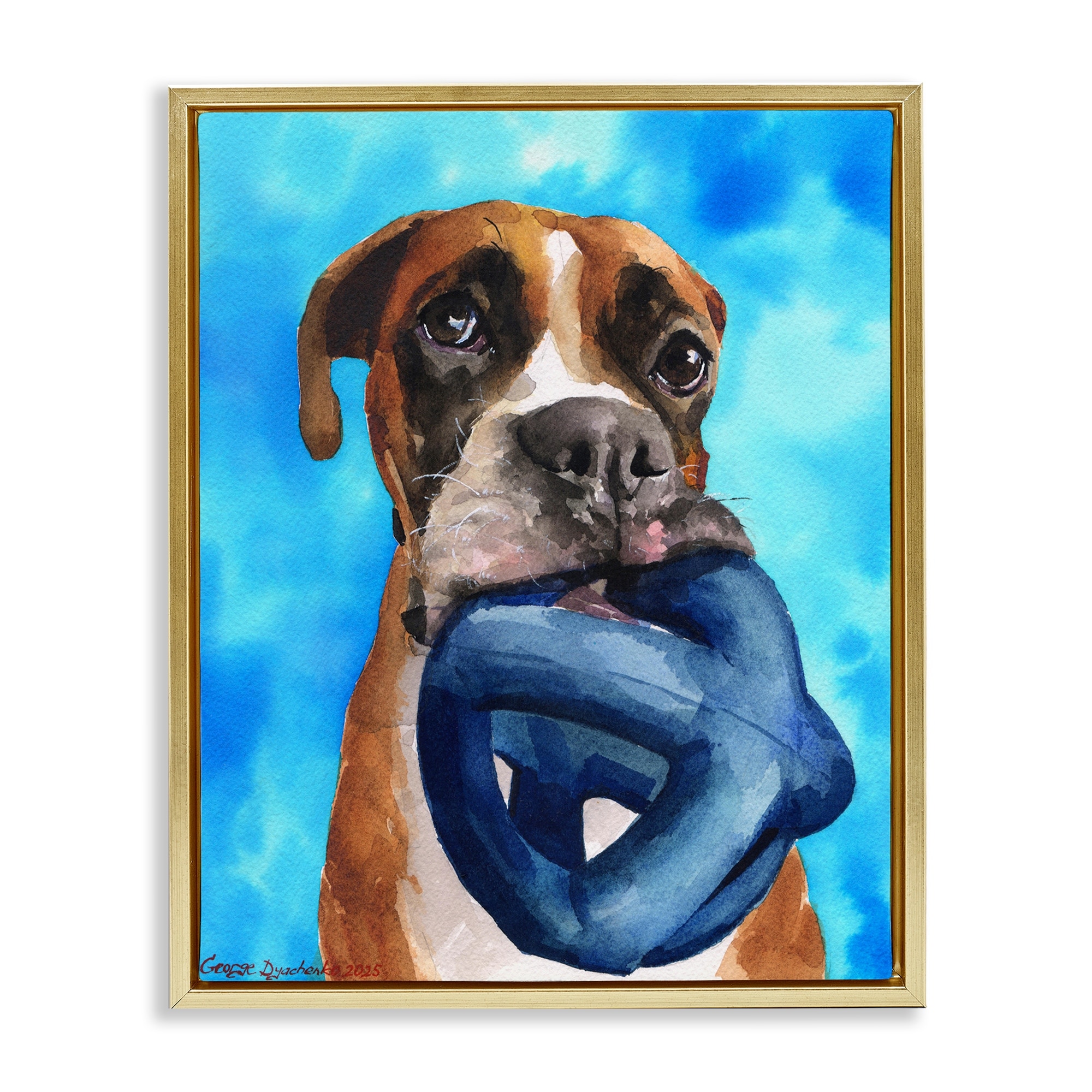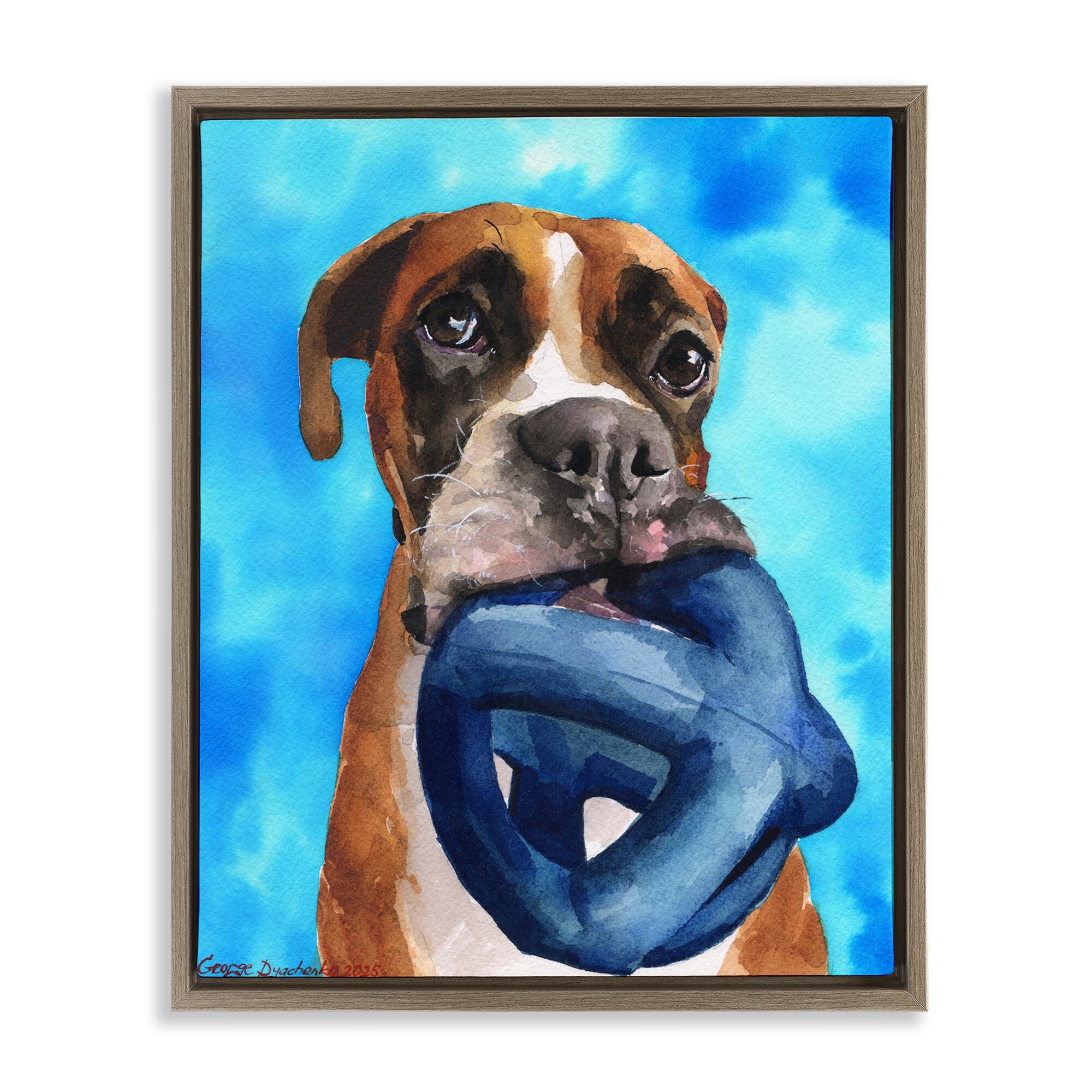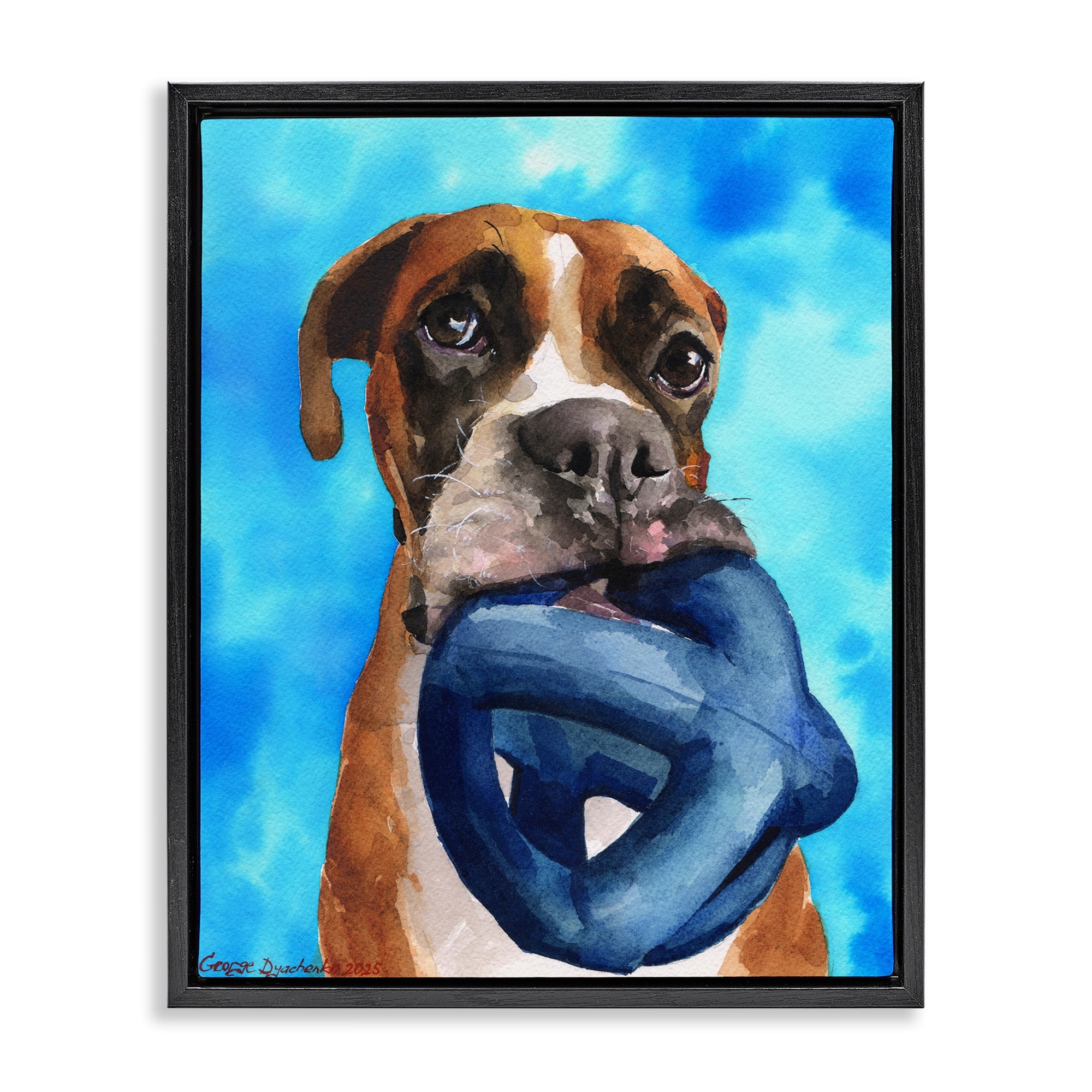 Stupell Boxer and His Toy Blue Framed Floater Canvas Wall Art Design By George Dyachenko
